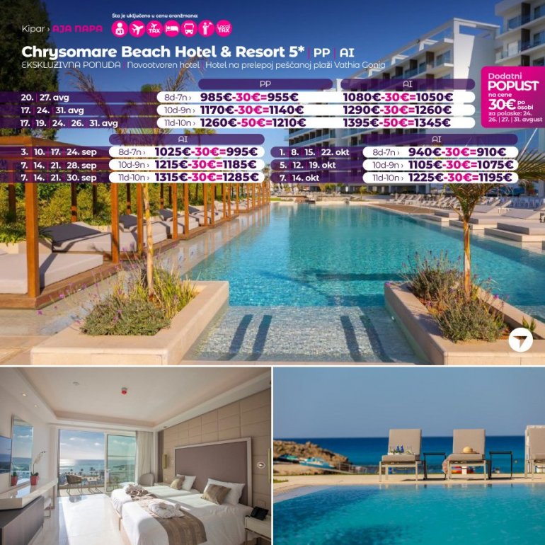 Од новосаграђених хотела у Аја Напи (2019/2020 год.), Chrysomare Beach Hotel & Resort, с правом се може сврстати међу најлуксузније и најбоље позициониране хотеле. Изграђен је на почетку једне од најлепших пешчаних увала Vathia Gonia, на само километар од центра града. Хотел има бројне садржаје: главни ресторан у коме се служе специјалитети локалне и интернационалне кухиње, италијански ресторан, грчку таверну, азијски ресторан, пет барова, неколико базена (унутрашњи базен, велики спољашњи базен са тобоганима, дечији базен...), луксузни Спа центар са масажама, ђакузијем, педикир/маникир салоном, фризерским салоном и великом теретаном. Целодневна забава је организована за све узрасте (мини клуб, програм за тинејџере, анимација за одрасле) и завршава се у касним вечерњим часовима фолклорним наступима, музичким представама или плесом. Све собе су климатизоване, имају балкон или терасу, САТ ТВ, телефон са директном линијом, кетлер, сеф, мини фрижидер, фен и тоалетни прибор. Бежични интернет је доступан у свим деловима хотела.