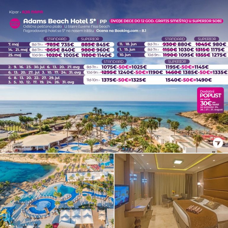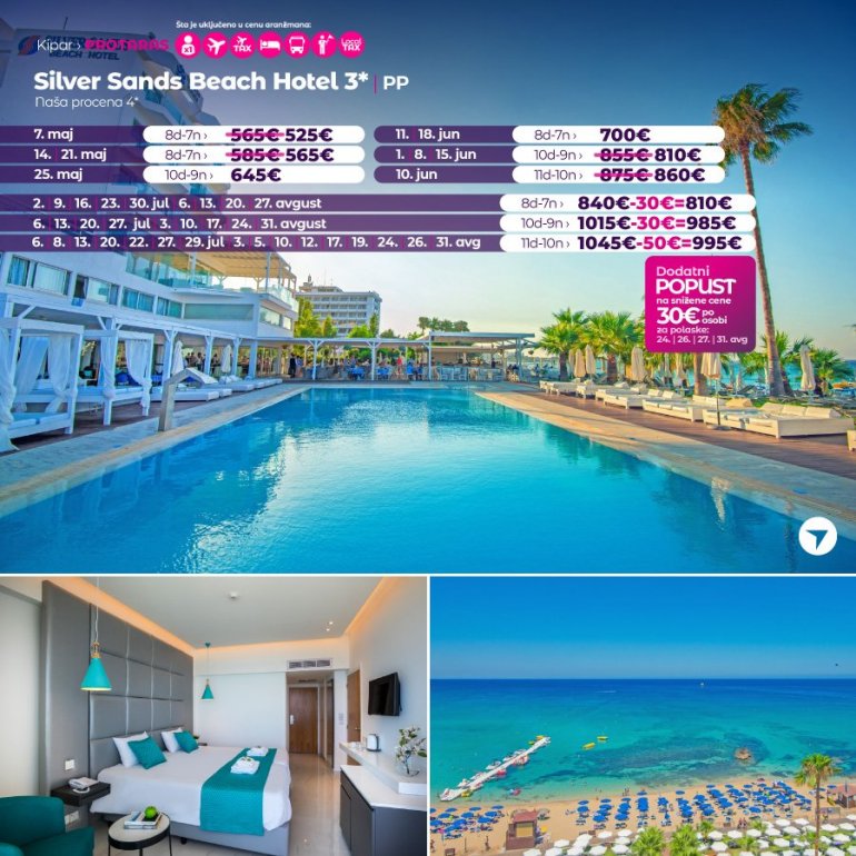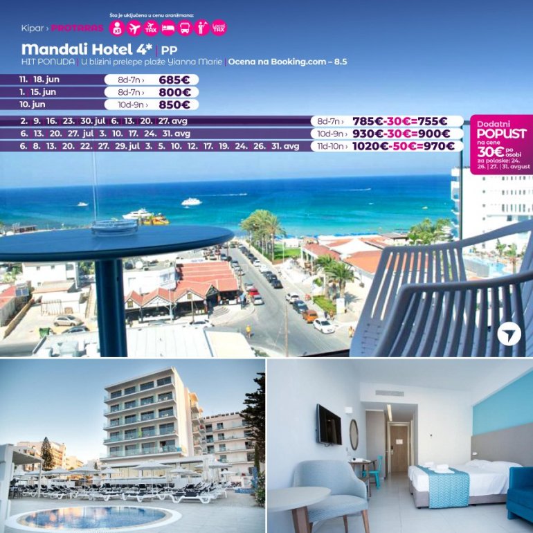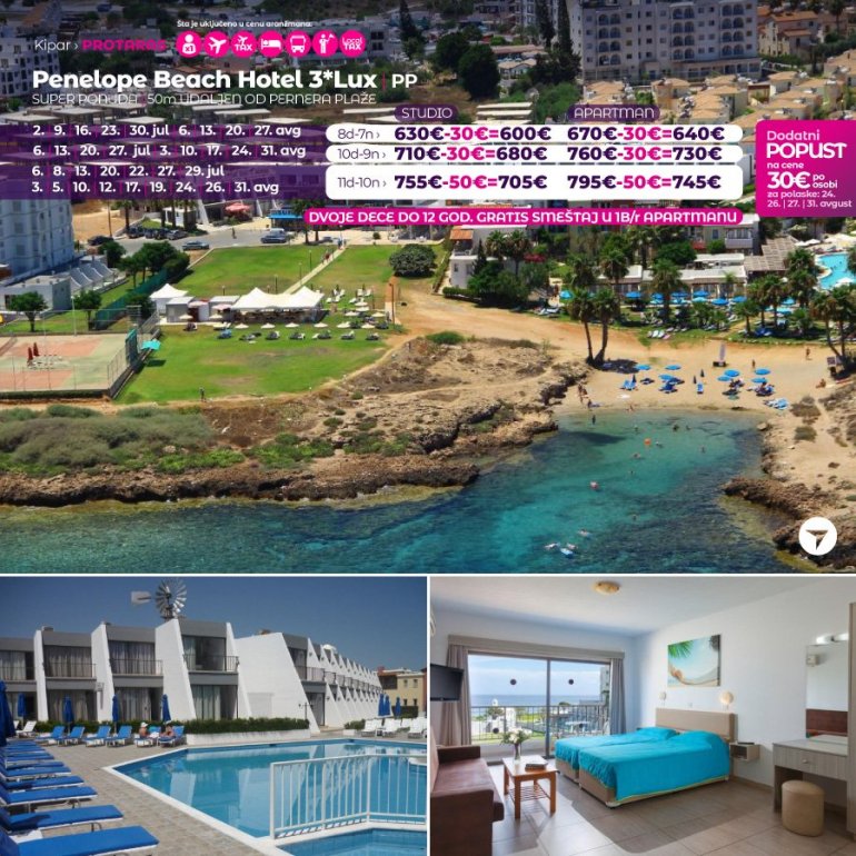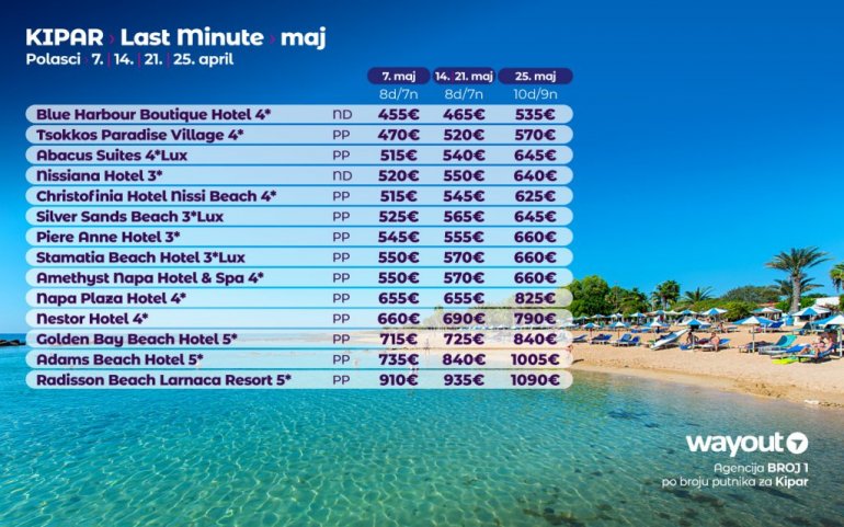 Дефинитивно нова омиљена летња дестинација наших туриста, свакако јесте рајско острво Кипар. Осетите чари Медитерана, фантастичних плажа, веома квалитетних хотела, изузетне гастрономске понуде, као и незаборавног ноћног провода. За наше путнике смо спремили одличну фирст минуте понуду са пажљиво изабраним хотелима, како на основу пређашњих искустава наших клијената, тако и на основу одличних оцена на туристичким порталима.