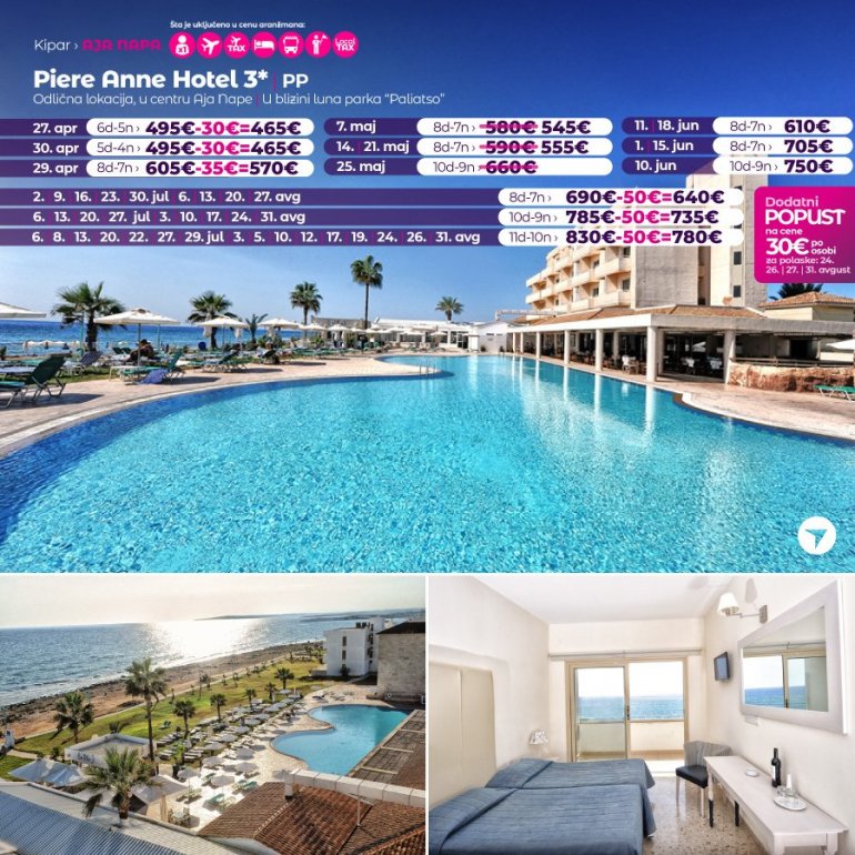 Хотел Пиере Анне има одличну локацију на обали мора, на 5 минута од центра Аја Напе и на 5 минута од луке и плаже. Забавни парк Parko Paliatso Fun се такође налази одмах иза хотела, заједно са чувеном улицом Nissi Avenue. У непосредној близини налазе се продавнице, барови и ресторани, а сви садржаји Аја Напе су на дохват руке. Хотел Piere Anne се састоји од 3 блока соба са 2 велика отворена базена. Базени имају директан приступ стази уз море, а бар поред базена "Ен Пло" је одлично место за опуштање током дана. Иако хотел нема много садржаја на лицу места, Piere Anne је толико близу свега у Аја Напи да је одлична база за забаву на плажи или провод у клубовима., као и одмор уз Медитеран.