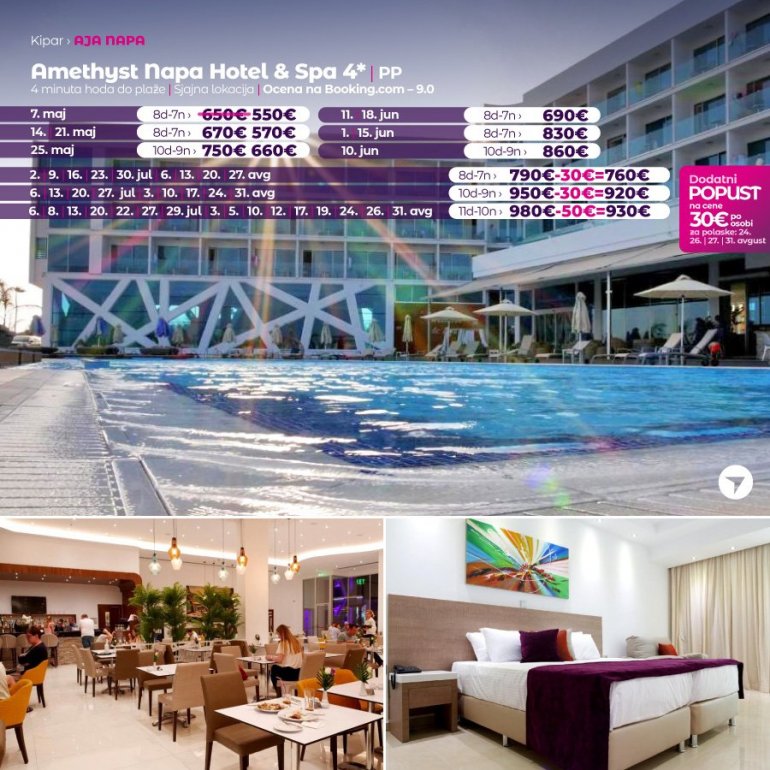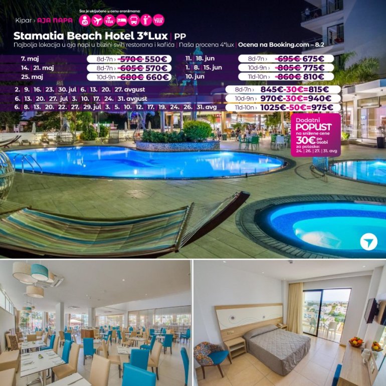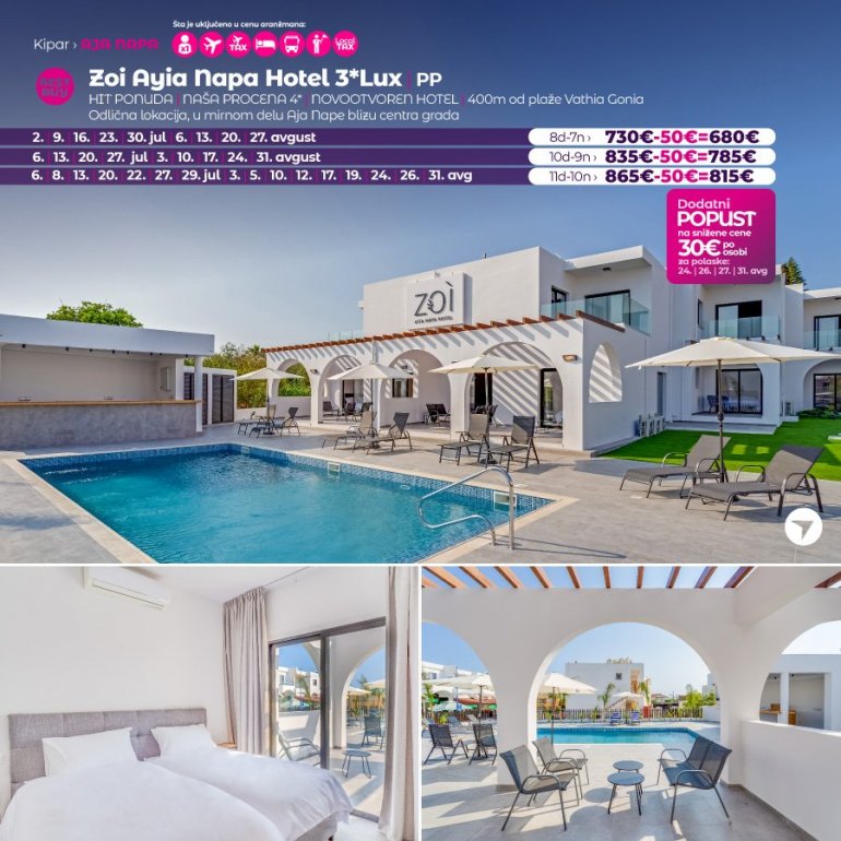 Представљамо вам хотел који средином јуна отвара своја врата за госте. У питању је потпуно нов хотел на одлицној локацији. Налази се у Аја Напи, на 15 минута сетње од центра овог места и у близини плазе Vathia Gonia. У близини хотела налази се бројни ресторани, барови и станица градског превоза. Хотел поседује WiFi, бар код рецепције, спољасњи базен и теретану. Собе су модерно опремљене, са АC уредјајем.