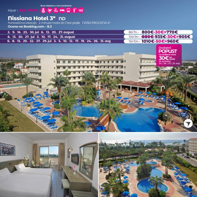 Времешни, али одлично одржаван комплекс Nissiana, састоји се од хотелске зграде и бунгалова, на неколико минута хода од најпознатије плаже у Аја Напи – Ниси плаже. Хотел има око 170 соба, а бунгаловски комплекс има 33 смештајне јединице типа студио (намењен за највише три особе) и типа апартман (за четири особе). До центра града се може стићи стазом уз обалу или главном улицом, за око пола сата хода, или градским превозом који стаје недалеко од хотела.