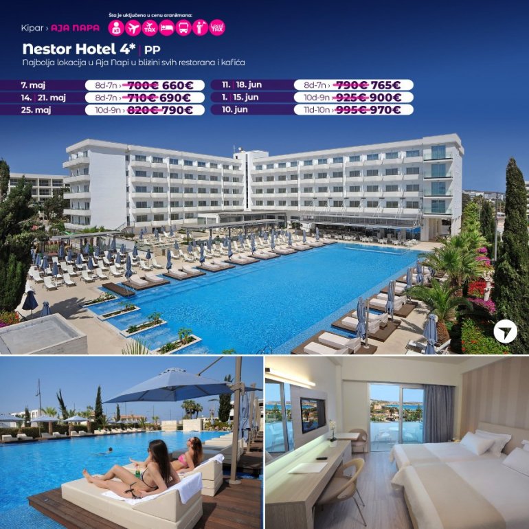 Модеран и у потпуности реновиран хотел Нестор, одлично је позициониран на само неколико минута шетње до прелепе пешчане плаже, марине и центра Аја Напе. Високо је оцењен на туристичким потралима и добитник је престижне плакете за висок квалитет услуге. Хотел од садржаја има: велики спољашњи базен са масажерима, унутрашњи базен, теретану, сауну, парно купатило, стони тенис, тениски терен, билијар, фризерски салон, дневну и вечерњу анимацију за одрасле, садржаје за децу – базен, авантура парк, ране оброке, анимацију, мини клуб. Собе су модерно опремљене, климатизоване, имају радио, фен, телефон, SAT LCD ТV, фрижидер, сеф, апарат за чај и кафу, wи-фи интернет (доступан и бесплатан у целом хотелу).