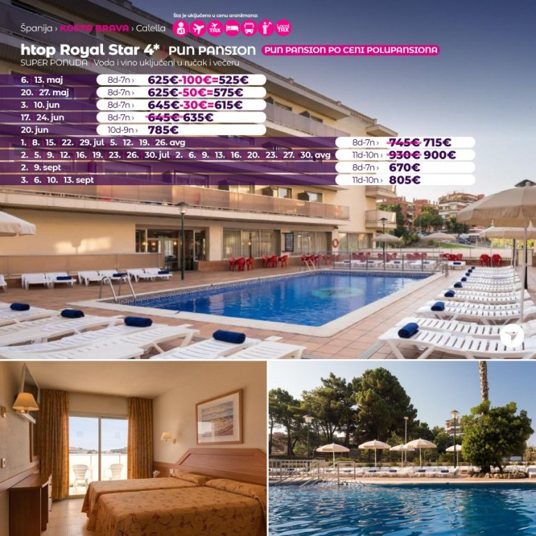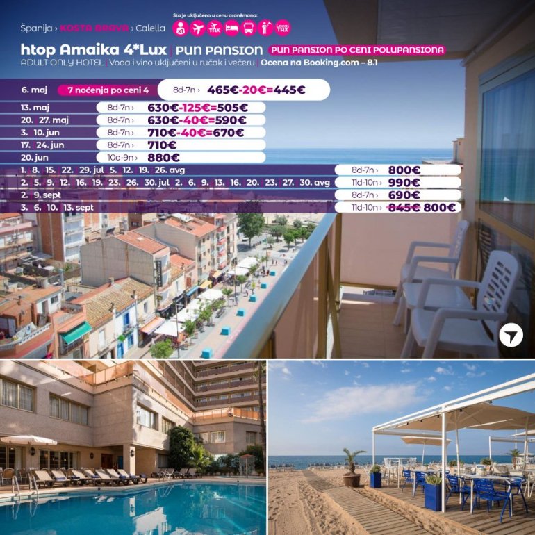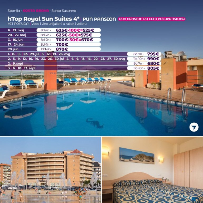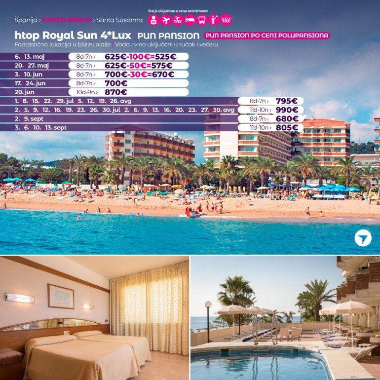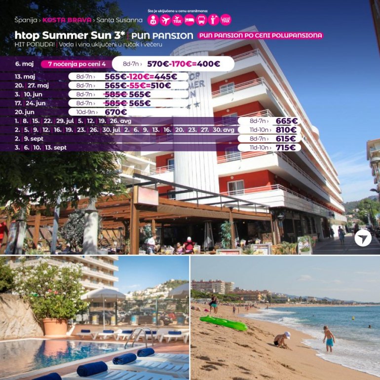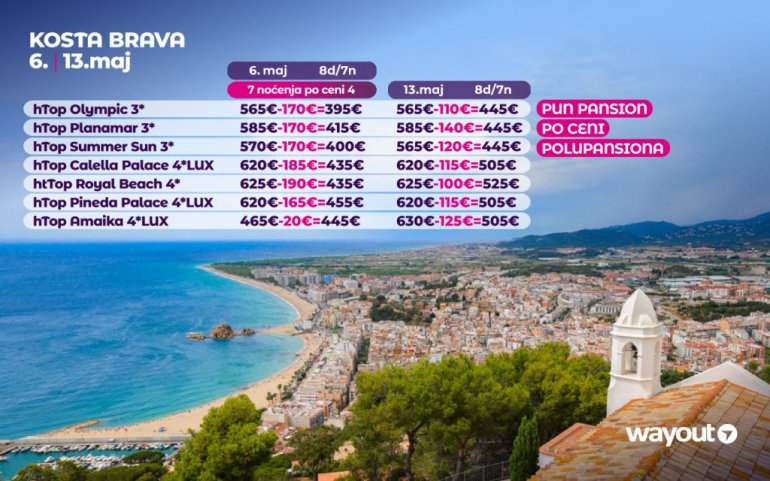 УКОЛИКО сте мислили да фантастичну Коста Браву можете посетити само аутобусом, преварили сте се. Wayoutu агенција је за своје путнике припремила неодољиву понуду за поменуту област која се налази надомак Барселоне, а као посебна погодност се издвајају хотели који нуде услугу пуног пансиона по цени полупансиона. У питању је познати хотелски ланац HTop Hotels, а у Wayoutu можете пронаћи поменуту понуду уз ексклузивне цене за летњу сезону почевши од мајских полазака када је и право време да уз посету Коста Брави, посетите и један од најлепших градова Старог континента, Барселону, која се налази на око сат времена удаљености од обале Коста Браве.
