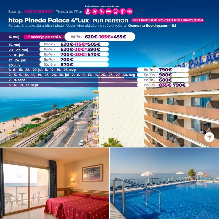 Дан можете провести сунчајући се на тераси на крову, опремљеној предивним базеном на отвореном са погледом на море. Док се опуштате, деца могу уживати у мини-клубу или у сопственом базену. Можете користити и хотелску сауну и теретану, као и бројне садржаје клуба здравља у објекту H•TOP Pineda Palace, које са хотелом повезује бесплатан организовани превоз аутобусом. Током вечери се можете опустити испред објекта уз забаву уживо, док уживате у породичном оброку из хотелског ресторана са услугом на бази шведског стола.