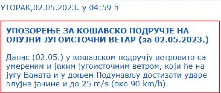 Ветар слаб и умерен, у кошавском подручју и на планинама јак, јужни и југоисточни, на југу Баната и у доњем Подунављу са ударима олујне јачине и до 25 м/с (око 90 км/х), а увече у већем делу у слабљењу.