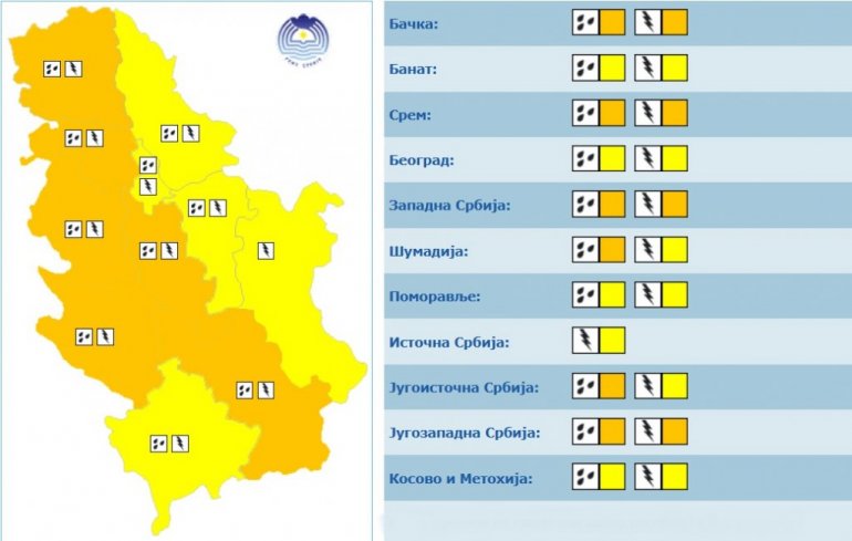 За Србију је РХМЗ објавио наранџасти и жути метеоаларм.