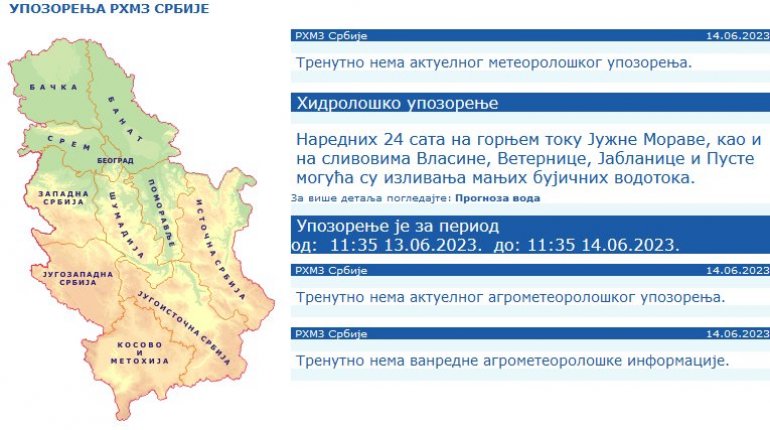 - Наредна 24 сата на горњем току Јужне Мораве, као и на сливовима Власине, Ветернице, Јабланице и Пусте могућа су изливања мањих бујичних водотока - наводи се на сајту РХМЗ-а.