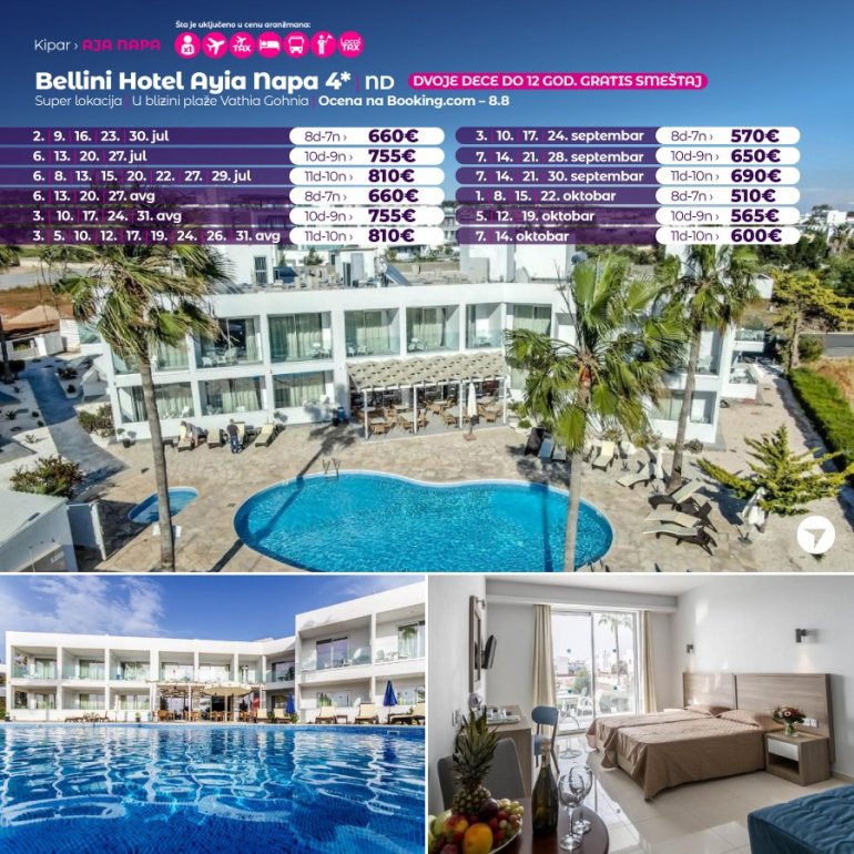 Потпуно реновиран хотел Bellini Ayia Napa је смештен у Авенији Ниси (Nissi Avenue), у срцу Аја Напе (Ayia Napa). У понуди има изванредно уређене апартмане. Осим тога, нуди студије и суите јединице које се налазе око приватног базена, бара и ресторана. Плаже Пернера и Сенди Беј (Sandy Bay) удаљене су око 500 метара од објекта. Плажа Ниси (Nissi Beach) је удаљена 2 км, а Аква парк Waterworld 3 км.