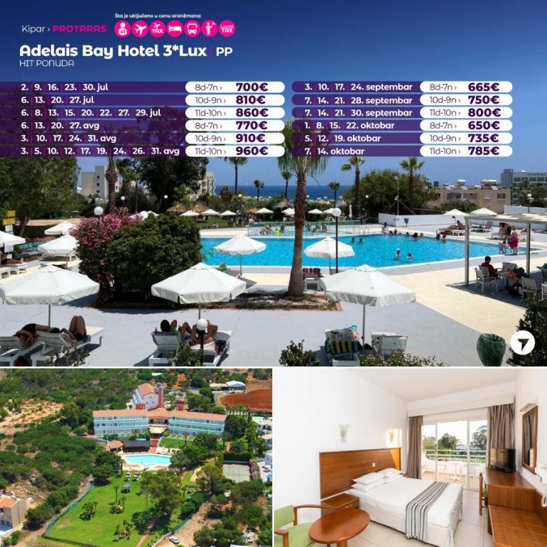 Хотел Adelais Bay удаљен је 500м од плаже Green bay, плажа која се налази између чувене Fig Tree плаже и Konnos плаже. Хотелски простор покрива велика башта са отвореним базеном. Собе су климатизоване са САТ ТВ и балконом или терасом. Свака соба поседује сопствено купатило са феном за косу. У саставу хотела је Аурора ресторан и бар Илиос поред базена. Опремљен је са игралиштем на отвореном са столицама за љуљање и играоницом, док се уз доплату може обезбедити услуга чувања деце. Град Протарас удаљен је од хотела 15 минута хода.