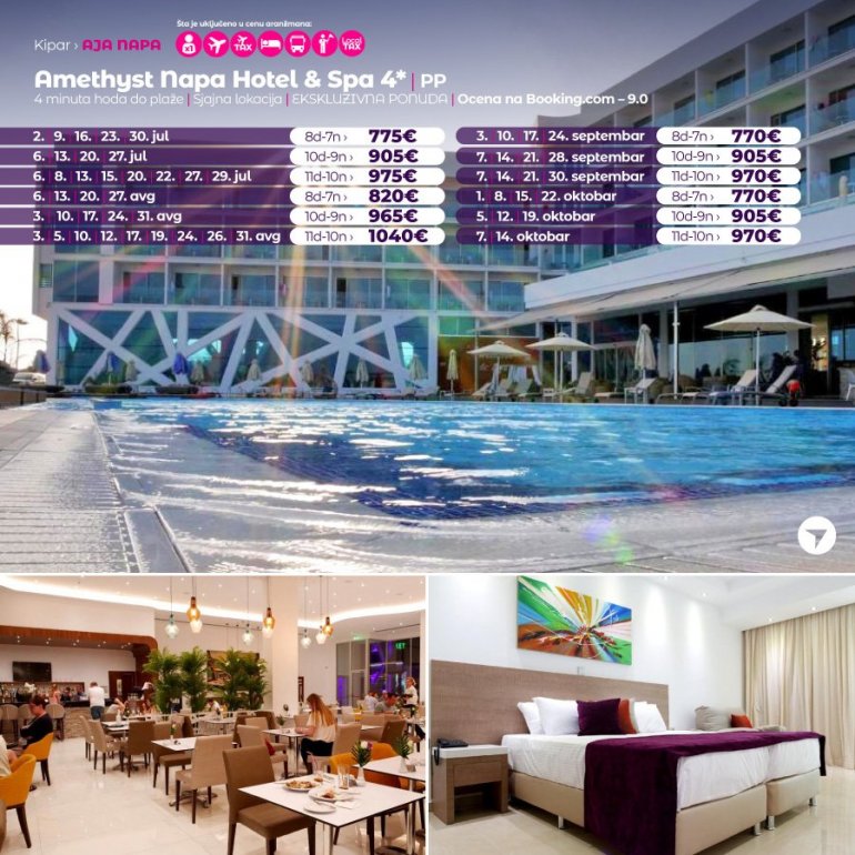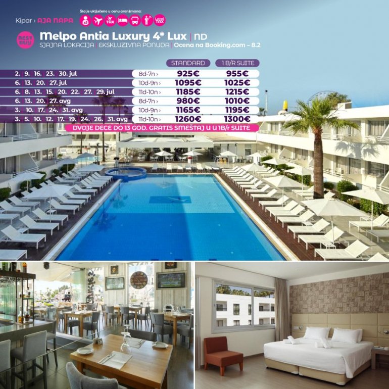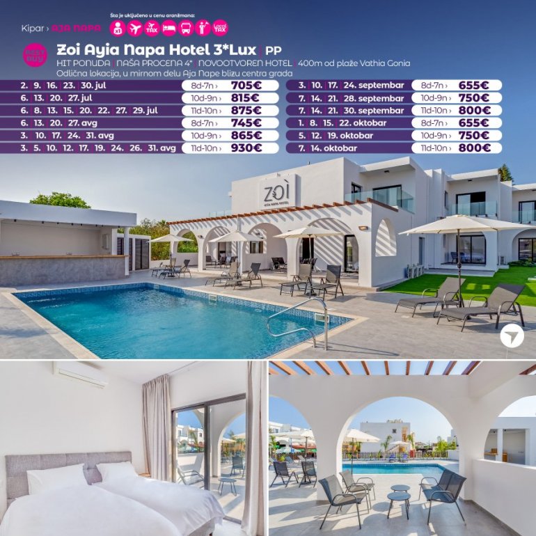 Представљамо вам хотел који средином јуна отвара своја врата за госте. У питању је потпуно нов хотел на одлицној локацији. Налази се у Аја Напи, на 15 минута сетње од центра овог места и у близини плазе Ватхиа Гониа. У близини хотела налази се бројни ресторани, барови и станица градског превоза. Хотел поседује WiFi, бар код рецепције, спољасњи базен и теретану. Собе су модерно опремљене, са АЦ уређајем.