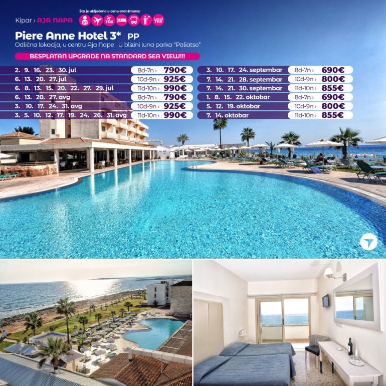 Хотел Piere Anne има одличну локацију на обали мора, на 5 минута од центра Аја Напе и на 5 минута од луке и плаже. Забавни парк Parko Paliatso Fun се такође налази одмах иза хотела, заједно са чувеном улицом Nissi Avenue. У непосредној близини налазе се продавнице, барови и ресторани, а сви садржаји Аја Напе су на дохват руке. Хотел Piere Anne се састоји од 3 блока соба са 2 велика отворена базена. Базени имају директан приступ стази уз море, а бар поред базена "En Plo" је одлично место за опуштање током дана. Иако хотел нема много садржаја на лицу места, Piere Anne је толико близу свега у Аја Напи да је одлична база за забаву на плажи или провод у клубовима, као и одмор уз Медитеран.