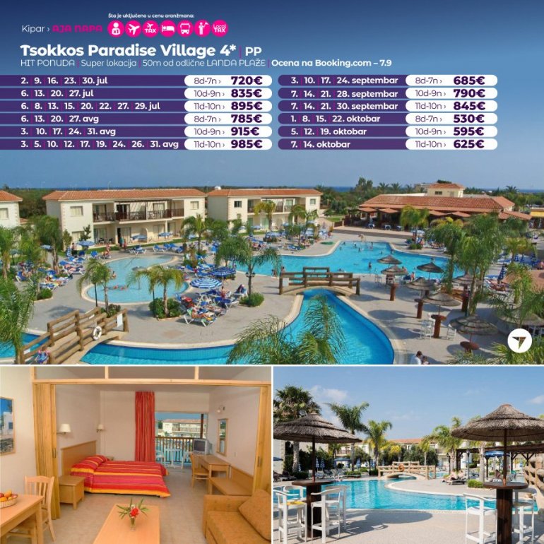Ово одмаралиште са 4 звездице налази се у летовалишту Аја Напа. Нуди затворени базен, фитнес центар, сауну и отворени базен неправилног облика, окружен намештеном терасом за сунчање. Садржаји одмаралишта Tsokkos Paradise такође обухватају ресторан-бар поред базена, играоницу са билијаром, тениски терен и мини-маркет.