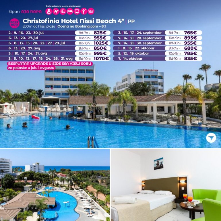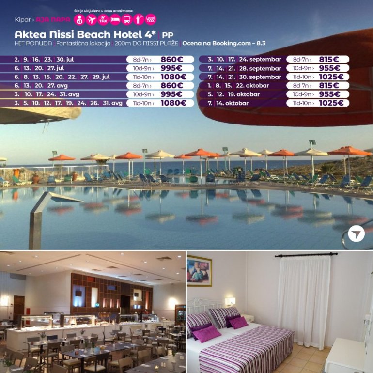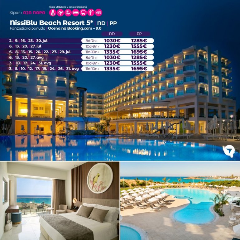 Nissiblu је нов, луксузан хотел, отворен пред сезону 2019 год. Налази се у лагуни Ниси плаже, најпознатије плаже у Аја Напи, на око 2 км од центра града. После само једне сезоне пословања, хотел је врло високо оцењен на туристичким порталима. Похвале од стране задовољних клијената се, осим савршене локације, односе и на изванредну храну, атмосферу, удобне собе и љубазно, стручно особље. Хотел је препорука наше агенције како за парове, тако и за породице са децом.