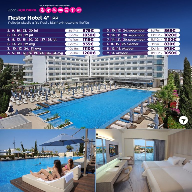 Модеран и у потпуности реновиран хотел Нестор, одлично је позициониран на само неколико минута шетње до прелепе пешчане плаже, марине и центра Аја Напе. Високо је оцењен на туристичким потралима и добитник је престижне плакете за висок квалитет услуге. Хотел од садржаја има: велики спољашњи базен са масажерима, унутрашњи базен, теретану, сауну, парно купатило, стони тенис, тениски терен, билијар, фризерски салон, дневну и вечерњу анимацију за одрасле, садржаје за децу – базен, авантура парк, ране оброке, анимацију, мини клуб. Собе су модерно опремљене, климатизоване, имају радио, фен, телефон, САТ ЛЦД ТВ, фрижидер, сеф, апарат за чај и кафу, wi-fi интернет (доступан и бесплатан у целом хотелу).