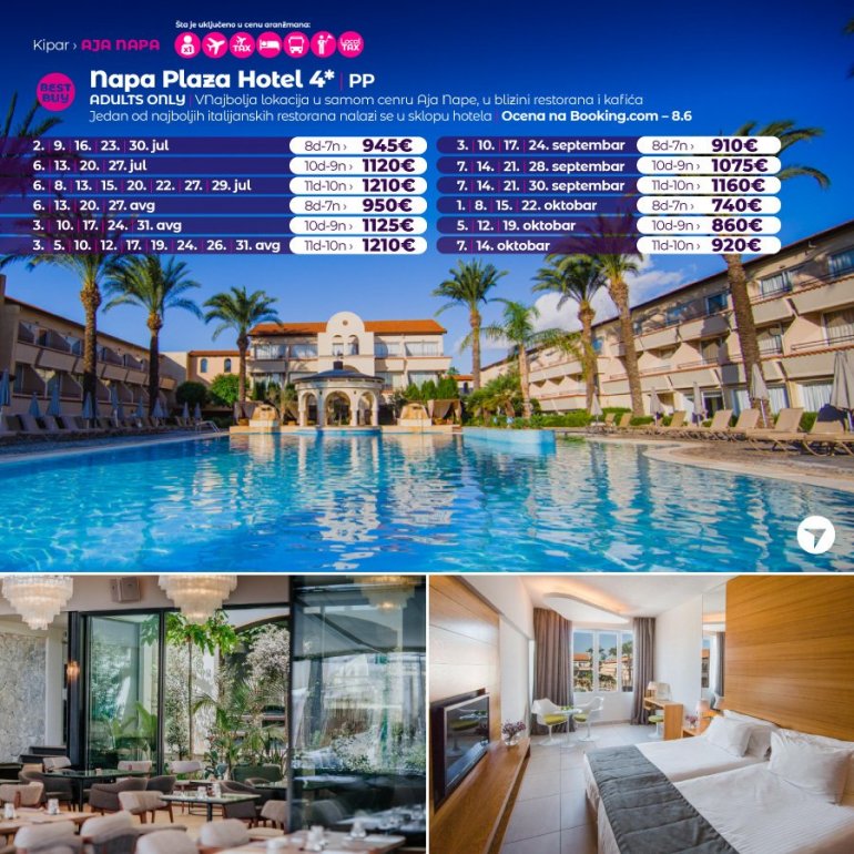 Ово је модеран и атрактиван хотел са четири звездице у срцу Аја Напе. Намењен је само одраслим гостима, а изграђен је 1989. године у близини средњовековног манастира. Овај централно лоцирани савремени и јединствени хотел који је саграђен у стилу трга нуди гостима приватност, префињеност и персонализовану услугу, што се и очекује од вишеструко награђиваног софистицираног окружења прилагођеног одраслима. Хотел је удаљен 7 минута хода од најближе градске плаже, километар од популарне Grecian bay плаже, 3 км од Nissi плаже и 4,5 км до Waterworld воденог парка. Објекат се налази у самом центру Аја Напе, окружен продавницама, кафићима и ресторанима. Аутобуска станица и стари Манастир су у непосредној близини, а недалеко су и музеј Thalassa, подводни музеј Мусан, парк скулптура и кактуса.