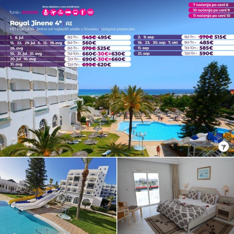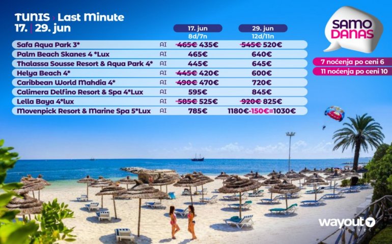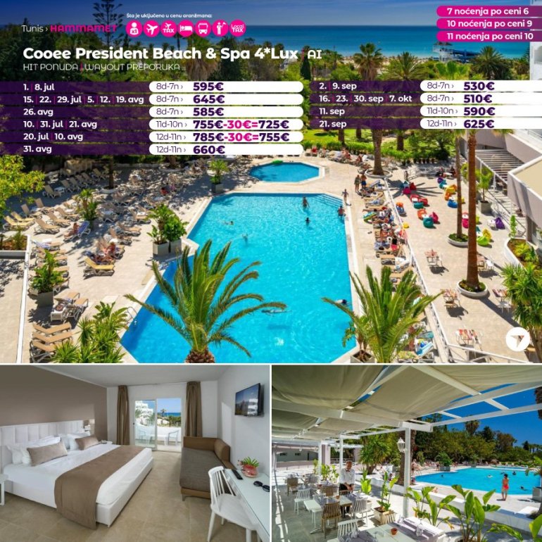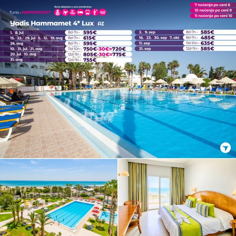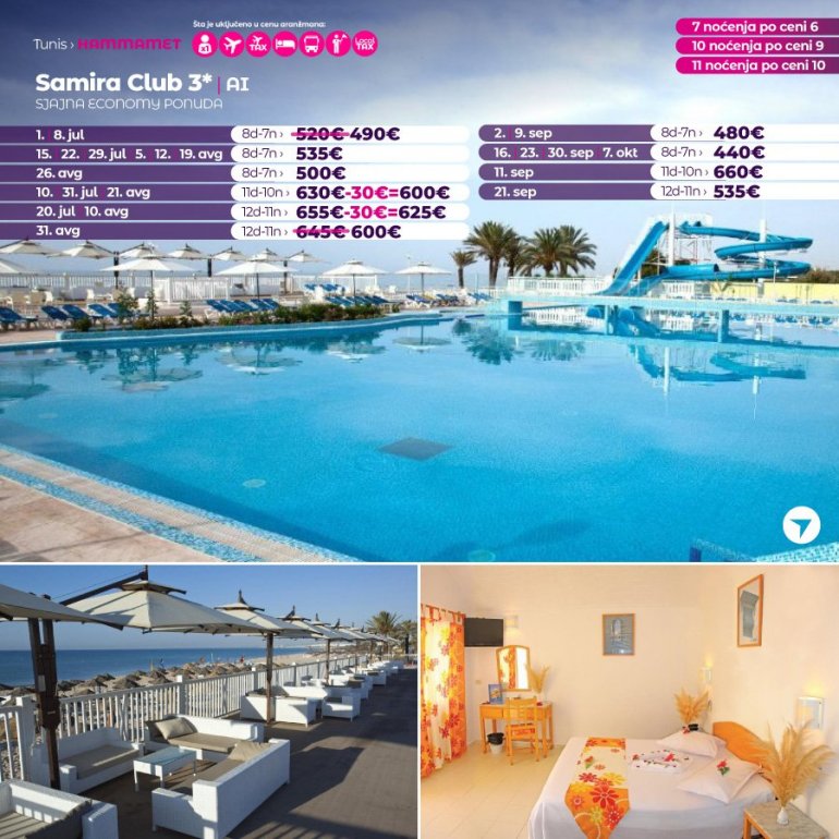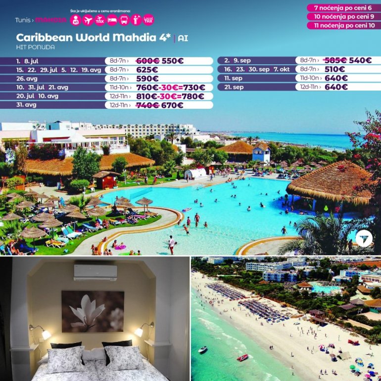 Искључиво са AirSerbia у Тунис! 7 ноћења по цени 6 ноћења / 10 ноћења по цени 9 ноћења / 11 ноћења по цени 10 ноћења. Издвајамо из понуде најтраженије хотеле за лето 2023: