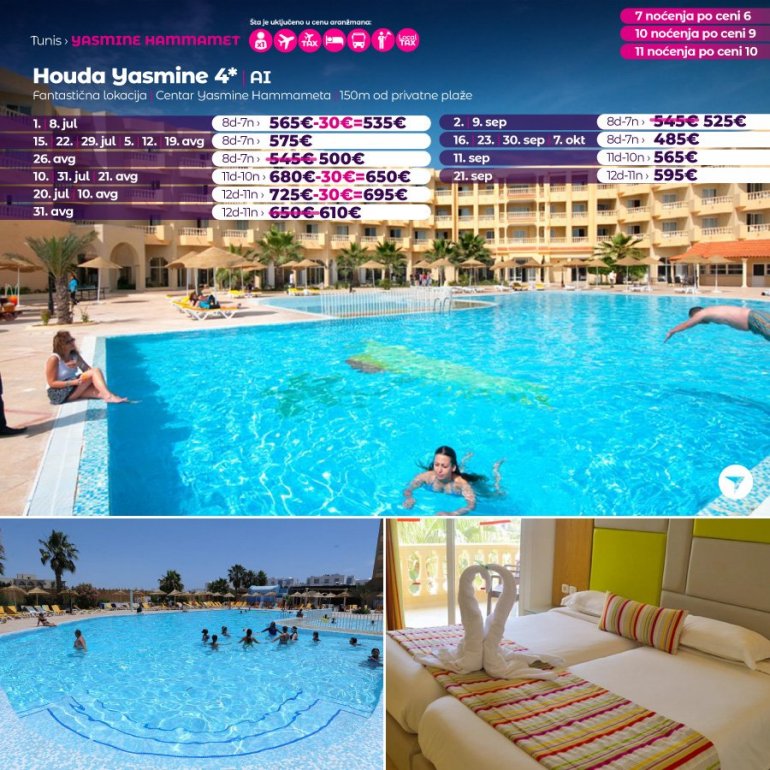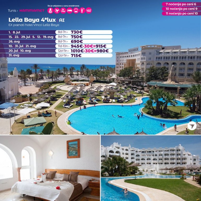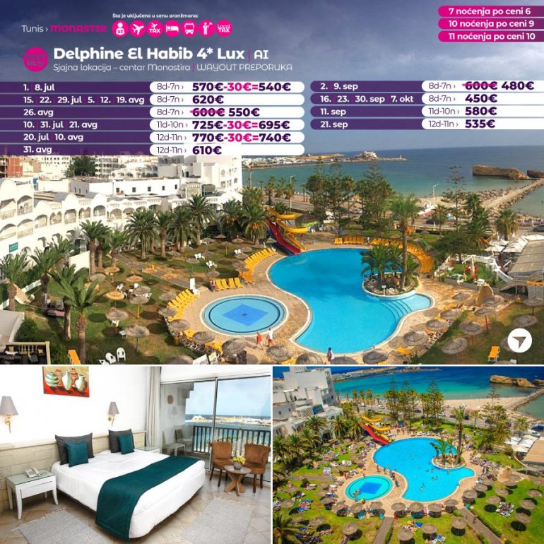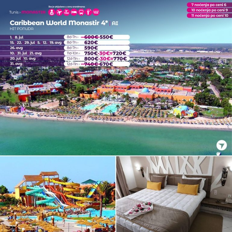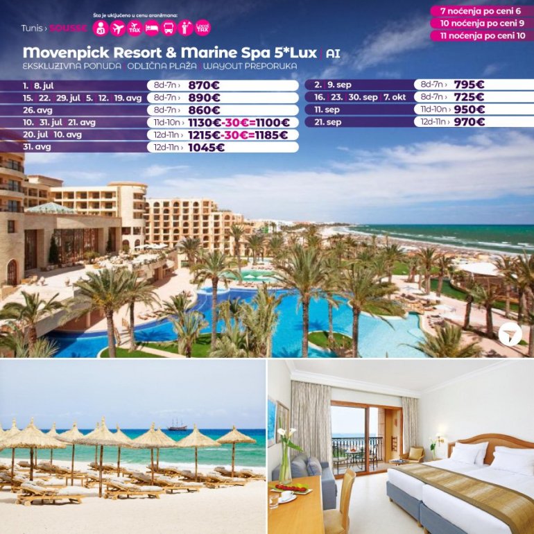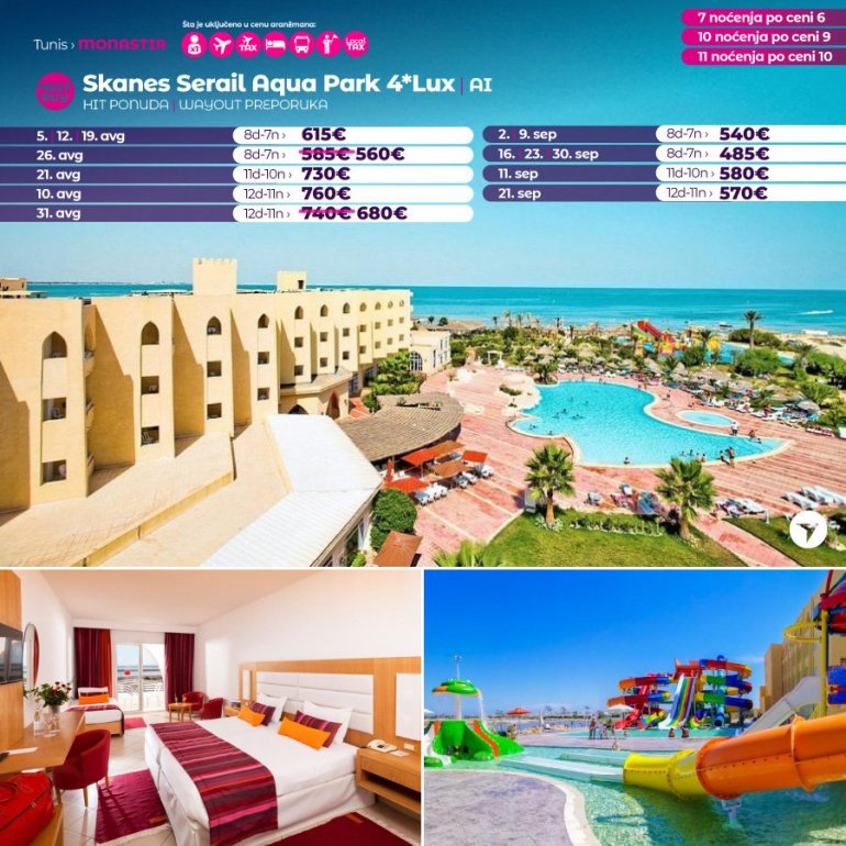 Искључиво са AirSerbia у Тунис! 7 ноћења по цени 6 ноћења / 10 ноћења по цени 9 ноћења / 11 ноћења по цени 10 ноћења. Издвајамо из понуде најтраженије хотеле за лето 2023: