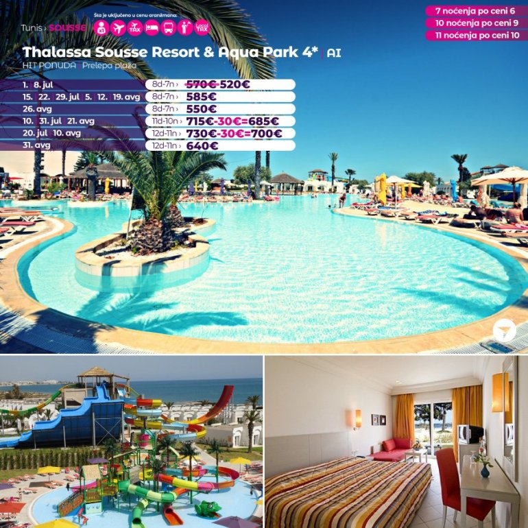 Thalassa Sousse resort & aquapark је all-inclusive хотел смештен на ободу прелепе плаже. Хотел је уређен у модерном и дизајнерском стилу. Простране и удобне собе садрже клима-уређај, телефон, фен за косу и балкон или терасу. Хотел Thalassa Sousse resort & aquapark поседује 4 ресторана, 6 барова, 5 базена, мини-клуб, тениски терен и мини-голф. Гостима нуди забавни програм за децу и одрасле, центар за балнеотерапију и салу за састанке капацитета од 10 до 100 особа. Хотел Thalassa Sousse resort & aquapark се налази у великом врту који се простире на 14 хектара. Налази се на 16 км од аеродрома Монастир, 4 км од Медине у Сусу и 7 км од луке Ел Кантауи.