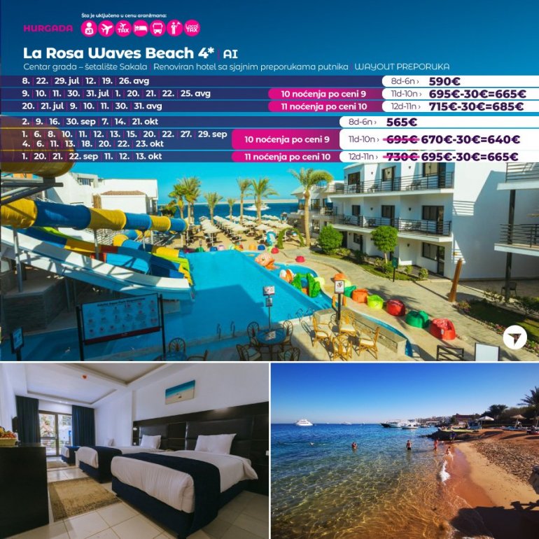 Објекат La Rosa Waves Beachнуди смештај поред плаже у Хургади, на нешто мање од 1 км од плаже Оранге. У понуди су разноврсни садржаји попут фитнес центра, бара и врта. Рецепција ради нон-стоп, а гостима овог објекта на располагању су ресторан, аква-парк и базен на отвореном. Понуда смештајног објекта укључује послугу у соби и дечији клуб.