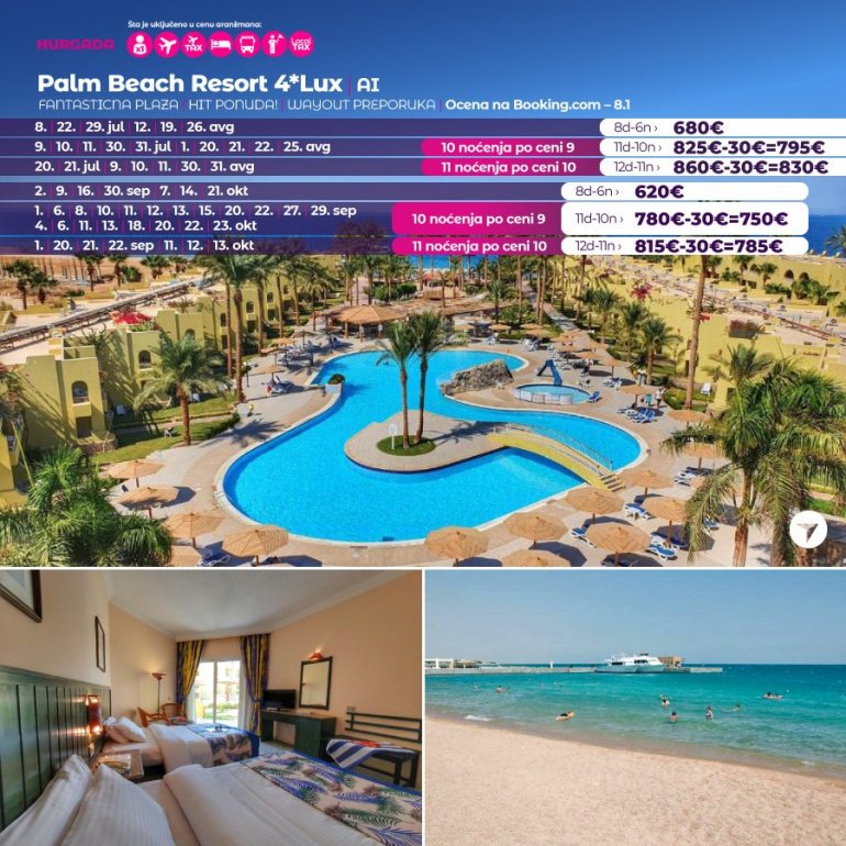 Palm Beach Resort hotel са 4 звездице налази се у Хургади и нуди собе са балконом уз живописан поглед на Црвено море. Поседује 2 базена, приватну плажу и ронилачки клуб. Климатизоване собе хотела Palm Beach Resort имају разнобојан ентеријер са дрвеним намештајем. Све собе укључују сателитску телевизију, мини-бар и сопствено купатило. Хотелски ресторан са услугом на бази шведског стола нуди локална јела као и интернационалну кухињу. Бар нуди освежавајућа пића и лагане оброке. Гостима је на располагању опуштајућа масажа у wellness центру, који такође има сауну и теретану. Аниматорски тим организује разне активности и игре током дана. Ронилачки клуб Aquarius нуди разне спортове на води, као што су роњење, гњурање и једрење на дасци. Међународни аеродром Хургада удаљен је 13 км од хотела Palm Beach. Бесплатан приватни паркинг је на располагању у оквиру објекта.