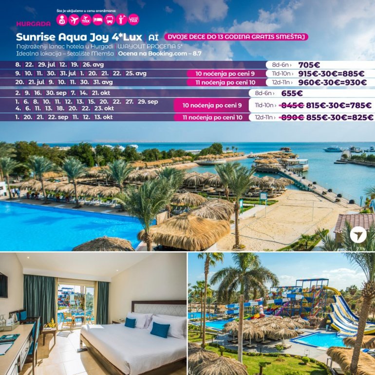Породични хотел који нуди 6 базена на отвореном, садржаје за паркинг и коришћење приватне плаже, а налази се поред плаже у Хургади. Понуда објекта Aqua Joy Resort- by SUNRISE укључује интернационалне, италијанске, азијске, египатске, грчке и ресторане који служе јела од морских плодова. У објекту се налази и 5 барова, укључујући шиша бар. Садржаји хотела обухватају аква-парк, теретану, спа центар и козметички салон.