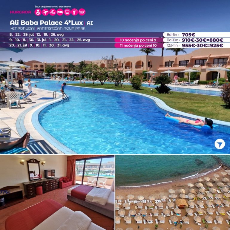 Ali Baba Palace је луксузни хотел са 4* отворен 2001.године на 120 000м2, који се налази 15 километра од центра Хургаде и 8 километара од аеродрома, јужно ка Сафаги. Хотел има сопствену пешчану плажу, прелепо уређен врт, велики базен који дају комплексу утисак оазе. Хотел располаже са 654 стандардне собе, од којих све имају климу, САТ ТВ, мини фрижидер, сеф, балкон. Гостима хотела су на располагању највећи отворени базен у Хургади (2700 м2), затворени базен, дечији базен који се греје, игралиште, главни ресторан, италијански ресторан, оријентални ресторан, 5 барова (на плажи, поред базена, у лобију), фитнес центар, 2 тениска терена, миниголф, одбојка на плажи, стони тенис, мини клуб за децу, куглање, клизање, сауна, собе за масажу, ђакузи, парно купатило, центар за спортове на води. Услуга у хотелу је на бази all inclusive концепта по правилима хотела.