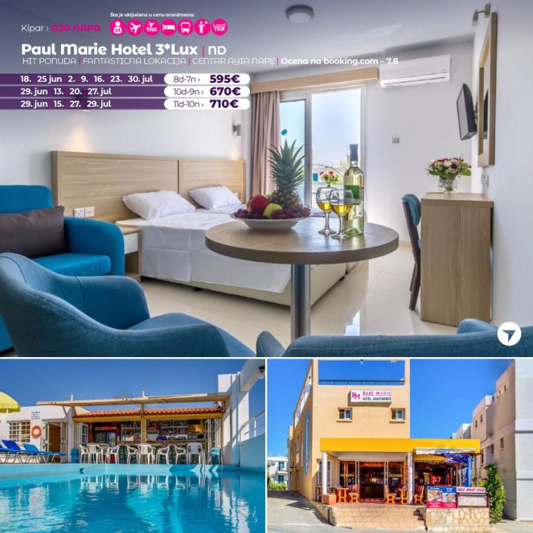 Објекат Paul Marie Hotel Apartments је смештен у центру летовалишта Аја Напа и располаже рестораном и кровним базеном на отвореном. WiFi је доступан у заједничким просторијама. Студији и апартмани у објекту Paul Marie Hotel садрже простор за седење и балкон са погледом на врт. Осим тога, имају чајну кухињу са плочама за кување и посуђем. Купатила у смештајним јединицама су опремљена феном за косу и тушем. Објекат Paul Marie Hotel Apartments такође нуди снек бар и рецепцију која ради нон-стоп. Међународни аеродром Ларнака је удаљен око 60 км. Понуда објекта обухвата и бесплатан паркинг.
