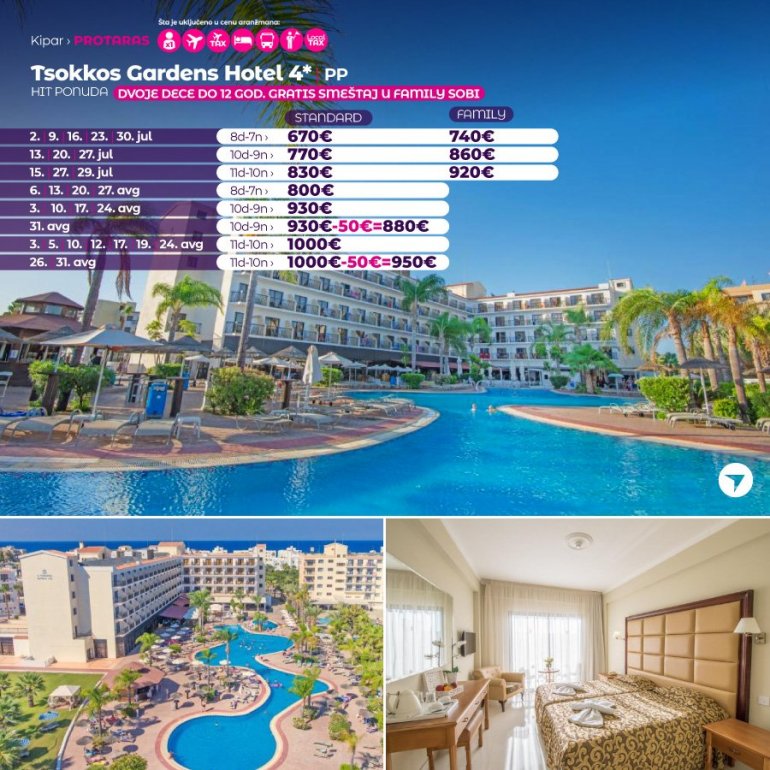 Хотел се налази у центру Протараса, 57км од аеродрома у Ларнаки, у близини најлепших пешчаних плажа, ресторана, барова, клубова и продавница. Од садржаја хотел има главни ресторан, кафетерију, бар на базену, Costa Coffee, спољашњи базен, базен за децу, стони тенис, тениски терен, Спа центар, сауну, теретану, дневну и вечерњу анимацију, продавницу сувенира, wi-fi интернет. Све собе су простране и модерно намештене, климатизоване, имају сеф, кетлер, мини фрижидер, САТ ТВ, фен, балкон. Гости који су на услузи ПАИ (premium ai), имају укључен у цену wi-fi интернет и коришћење сефа у соби.