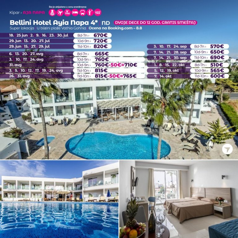 Потпуно реновиран хотел Bellini Ayia Napa је смештен у Авенији Ниси (Nissi Avenue), у срцу Аја Напе (Ayia Napa). У понуди има изванредно уређене апартмане. Осим тога, нуди студије и suite јединице које се налазе око приватног базена, бара и ресторана. Плаже Пернера и Сенди Беј (Sandy Bay) удаљене су око 500 метара од објекта. Плажа Ниси (Nissi Beach) је удаљена 2 км, а Аква парк Waterworld 3 км.
