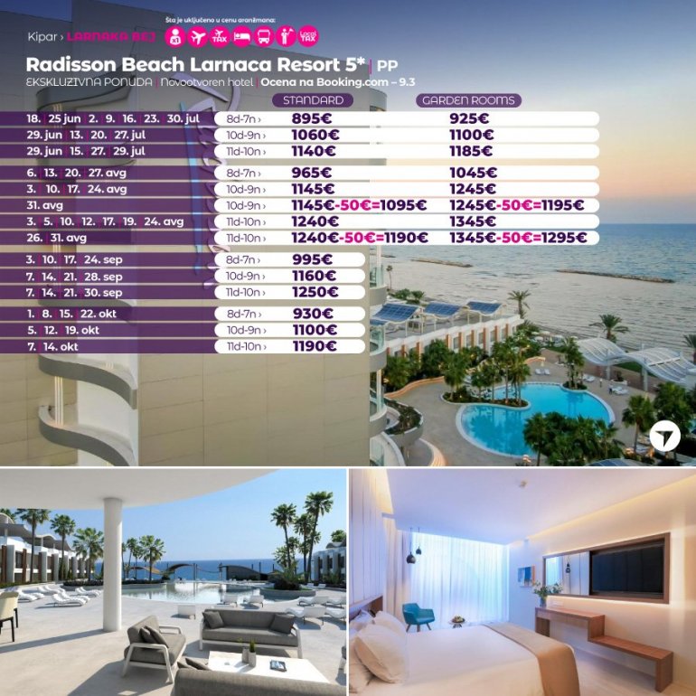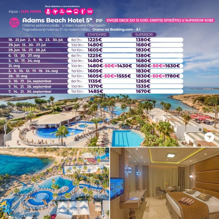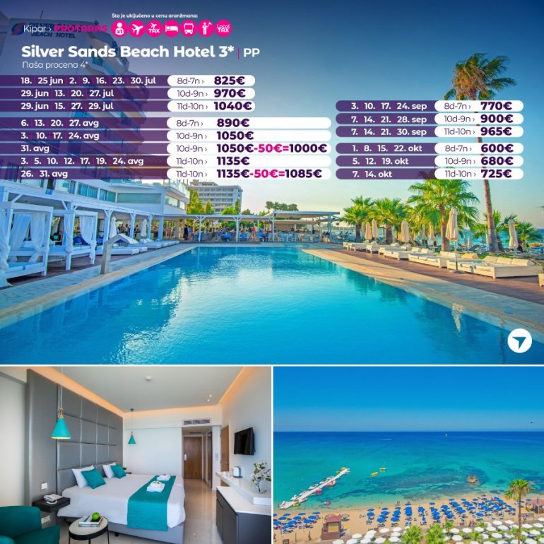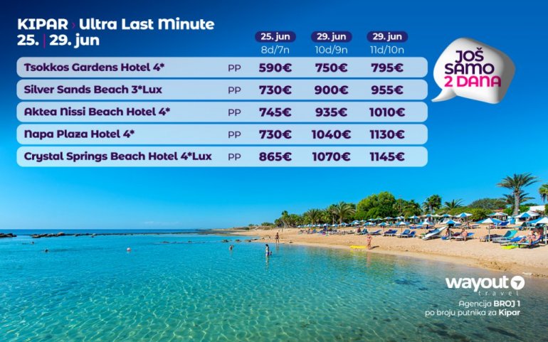 Дефинитивно нова омиљена летња дестинација наших туриста, свакако јесте рајско острво Кипар. Осетите чари Медитерана, фантастичних плажа, веома квалитетних хотела, изузетне гастрономске понуде, као и незаборавног ноћног провода. За наше путнике смо спремили одличну first minute понуду са пажљиво изабраним хотелима, како на основу пређашњих искустава наших клијената, тако и на основу одличних оцена на туристичким порталима.
