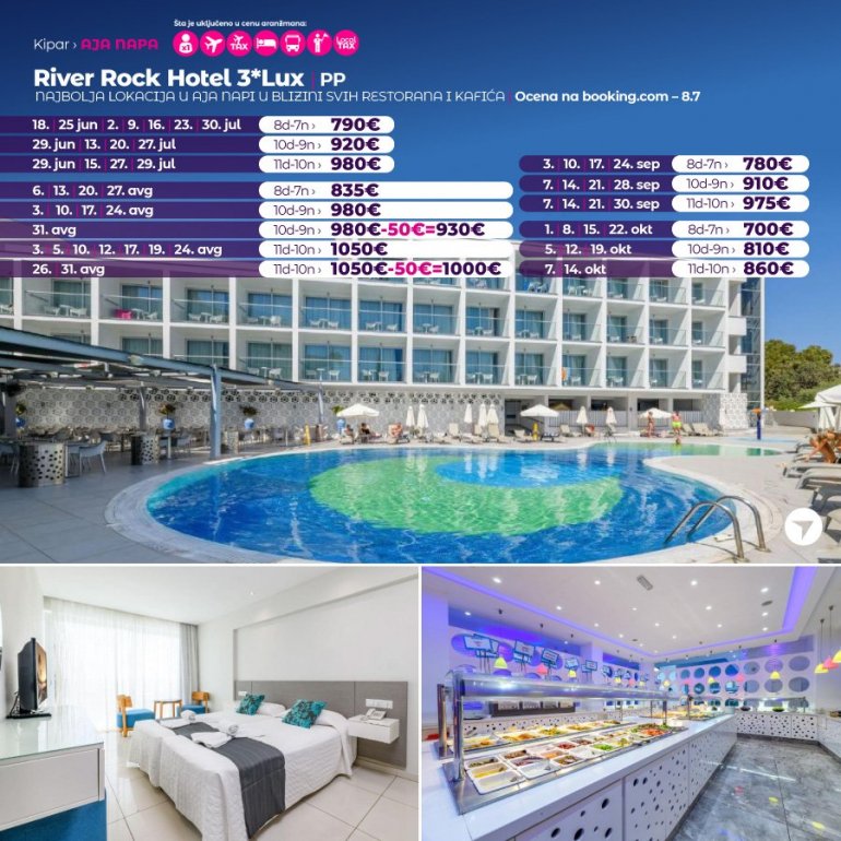 Хотел River Rock налази се у месту Аја Напа и поседује отворени базен и терасу за сунчање. На располагању је дечије игралиште, а бесплатан бежични интернет је доступан у целом објекту. Све собе нуде балкон са погледом на град. Поред тога садрже flat-screen ТВ и клима-уређај. Гостима је на располагању сопствено купатило са тушем и феном за косу. Додатне погодности укључују сеф, фрижидер и постељину. Понуда хотела River Rock укључује рецепцију која ради нон-стоп, врт и бар.