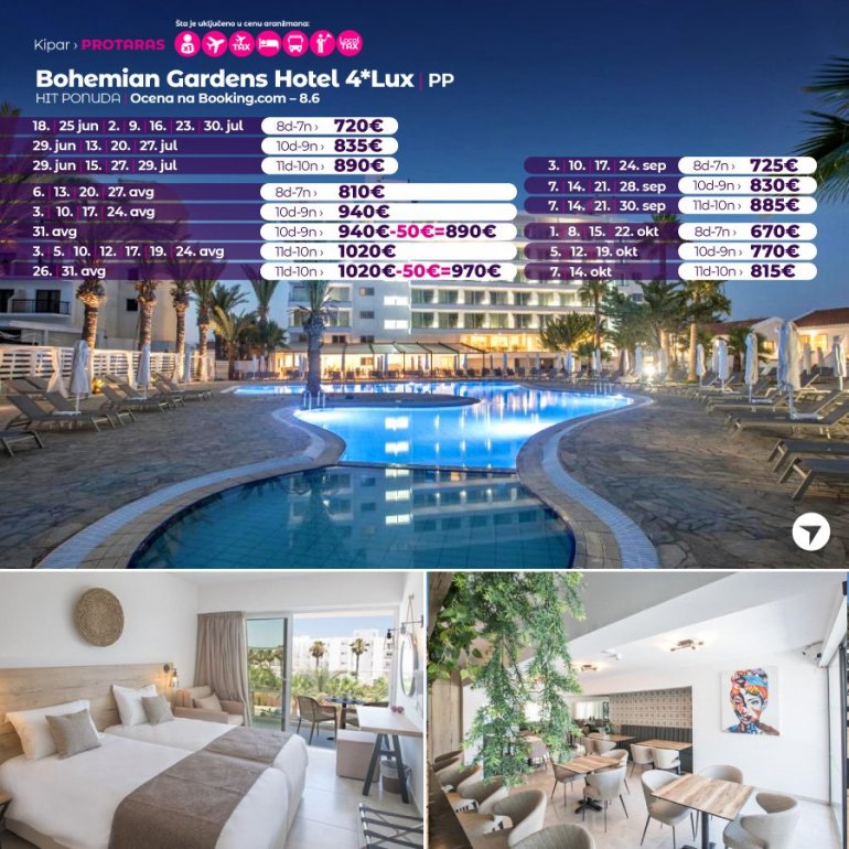 Хотел је смештен у близини Marlita Bay, у делу Протараса који се зове Пернера – један од најживљих делова овог града. Bohemian Gardens Hotel са 4* је зграда са 5 спратова, са 133 собе и 8 бунгалова. Хотел је отворен у јулу 2020. године и уређен је у бохо стилу.