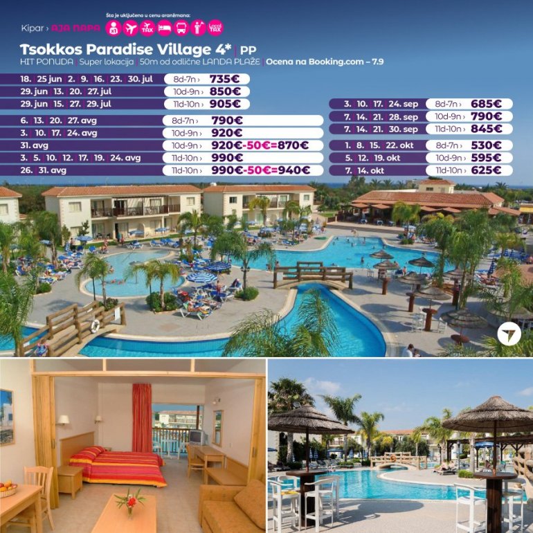 Ово одмаралиште са 4 звездице налази се у летовалишту Аја Напа. Нуди затворени базен, фитнес центар, сауну и отворени базен неправилног облика, окружен намештеном терасом за сунчање. Садржаји одмаралишта Tsokkos Paradise такође обухватају ресторан-бар поред базена, играоницу са билијаром, тениски терен и мини-маркет.