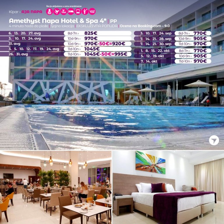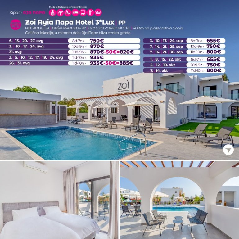 Представљамо вам хотел који средином јуна отвара своја врата за госте. У питању је потпуно нов хотел на одличној локацији. Налази се у Аја Напи, на 15 минута шетње од центра овог места и у близини плазе Vathia Gonia. У близини хотела налази се бројни ресторани, барови и станица градског превоза. Хотел поседује WiFi, бар код рецепције, спољашњи базен и теретану. Собе су модерно опремљене, са АЦ уређајем.