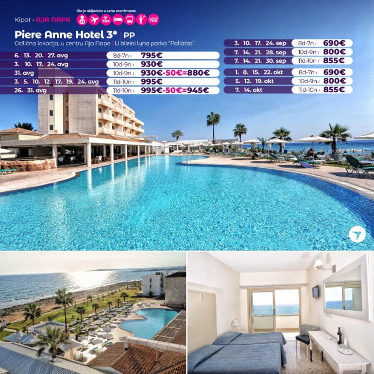 Hotel Piere Anne има одличну локацију на обали мора, на 5 минута од центра Аја Напе и на 5 минута од луке и плаже. Забавни парк Parko Paliatso Fun се такође налази одмах иза хотела, заједно са чувеном улицом Nissi Avenue. У непосредној близини налазе се продавнице, барови и ресторани, а сви садржаји Аја Напе су на дохват руке. Hotel Piere Anne се састоји од 3 блока соба са 2 велика отворена базена. Базени имају директан приступ стази уз море, а бар поред базена "Ен Пло" је одлично место за опуштање током дана. Иако хотел нема много садржаја на лицу места, Piere Anne је толико близу свега у Аја Напи да је одлична база за забаву на плажи или провод у клубовима, као и одмор уз Медитеран.