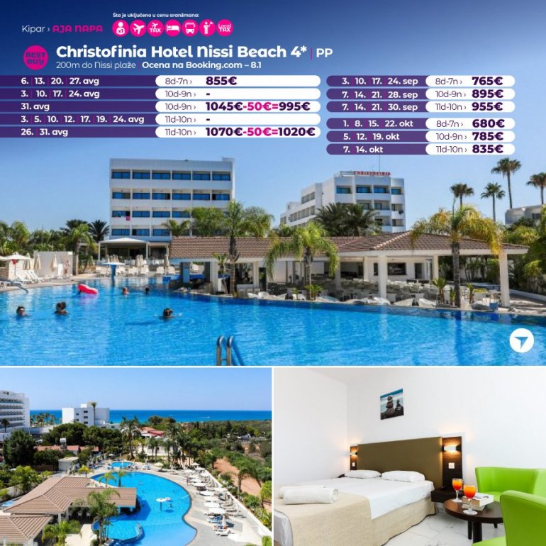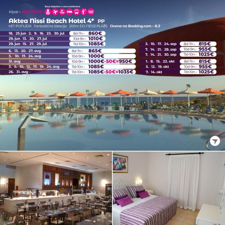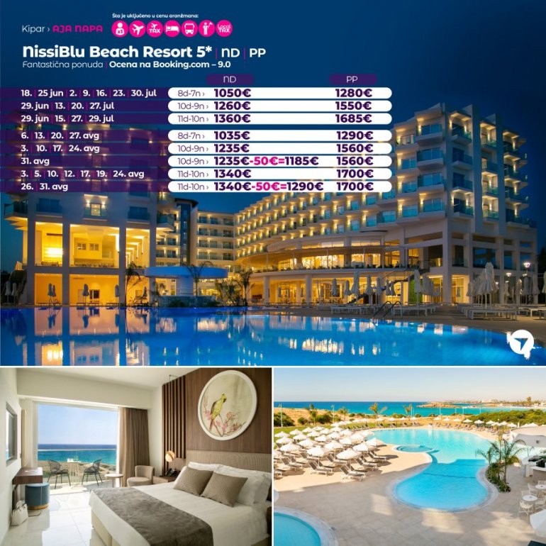 Nissiblu је нов, луксузан хотел, отворен пред сезону 2019 год. Налази се у лагуни Ниси плаже, најпознатије плаже у Аја Напи, на око 2 км од центра града. После само једне сезоне пословања, хотел је врло високо оцењен на туристичким порталима. Похвале од стране задовољних клијената се, осим савршене локације, односе и на изванредну храну, атмосферу, удобне собе и љубазно, стручно особље. Хотел је препорука наше агенције како за парове, тако и за породице са децом.