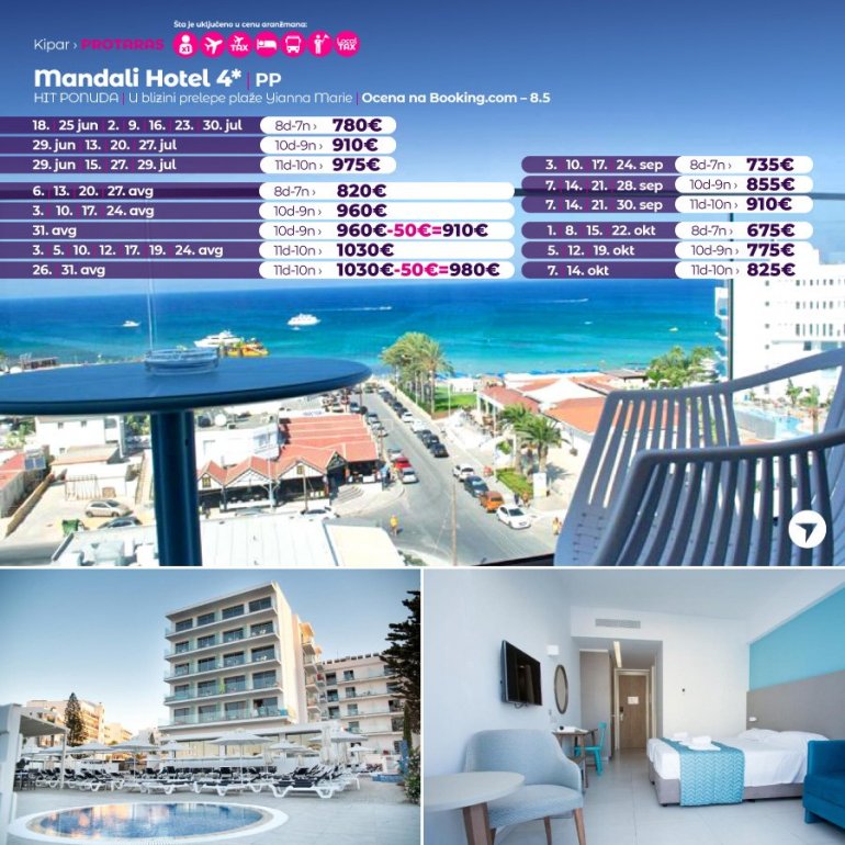 Овај објекат је удаљен 4 мин хода од песковите плаже у Протарасу. Такође, хотел поседује и спољашњи и унутрашњи базен са лежаљкама. Свака соба у Мандали хотелу садржи: кетлер, мини фрижидер, тв и приватни балкон. У купатилима се налази фен. У хотелу је доступан ресторан са локалним специјалитетима. Поред базена се налази бар. На улазу у хотел се налази супермаркет где можете пронаћи све намирнице за припремање хране. Популарна плажа Fig Tree се налази на 1км од хотела, град Agia Napa је удаљен 12км док је аеродром у Ларнаки удаљен 45 км. Хотел пружа бесплатно паркинг место.