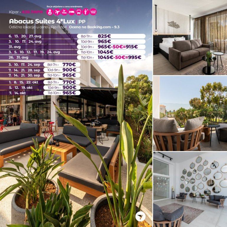 Abacus Suites је потпуно нов хотел, са највишим оценама на туристичким порталима. Изузетно је лоциран, на неколико минута хода од центра Аја Напе и плаже. У непосредној близини хотела налазе се ресторани, кафићи, барови, продавнице и станица градског превоза. Идеалан је избор како за парове, тако и за породице, због пространих соба и услуге која може бити полупансион или all inclusive.