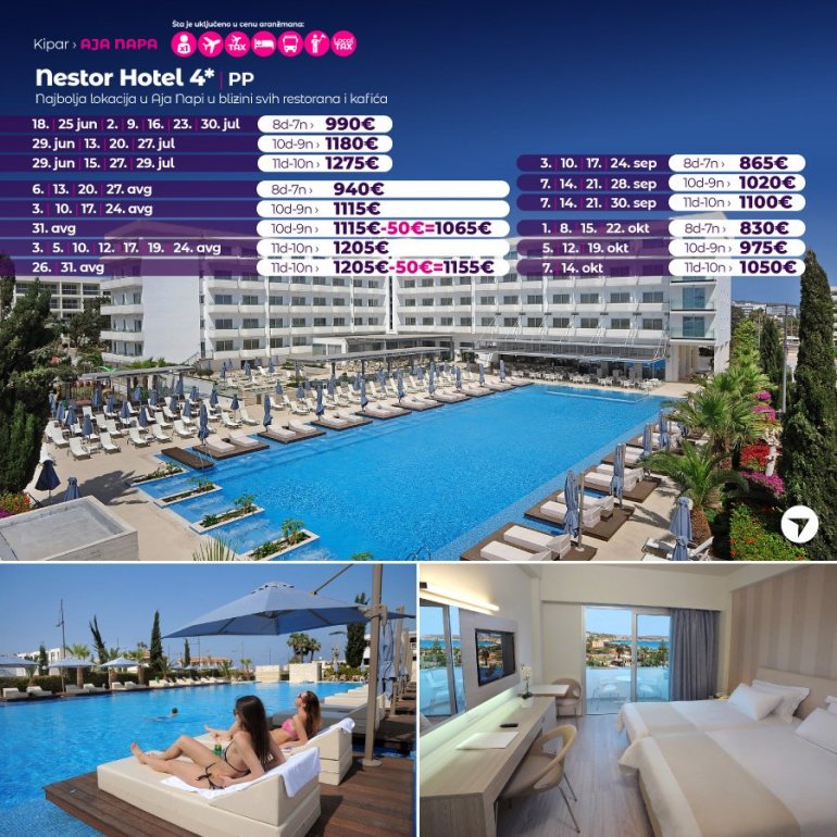 Модеран и у потпуности реновиран хотел Нестор, одлично је позициониран на само неколико минута шетње до прелепе пешчане плаже, марине и центра Аја Напе. Високо је оцењен на туристичким потралима и добитник је престижне плакете за висок квалитет услуге. Хотел од садржаја има: велики спољашњи базен са масажерима, унутрашњи базен, теретану, сауну, парно купатило, стони тенис, тениски терен, билијар, фризерски салон, дневну и вечерњу анимацију за одрасле, садржаје за децу – базен, авантура парк, ране оброке, анимацију, мини клуб. Собе су модерно опремљене, климатизоване, имају радио, фен, телефон, САТ ЛЦД ТВ, фрижидер, сеф, апарат за чај и кафу, wi-fi интернет (доступан и бесплатан у целом хотелу).