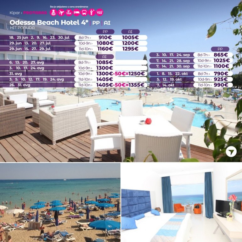 Одличан хотел, лоциран недалеко од центра Протараса, на најлепшем делу дугачке пешчане плаже. Од садржаја хотел има ресторан, бар, спољашњи базен, дечији базен, тениски терен, теретану, анимацију током дана и вечери, музички програм. Све собе су климатизоване, имају ТВ, фен, телефон, а уз доплату могу се користити фрижидер, сеф и wi-fi интернет.