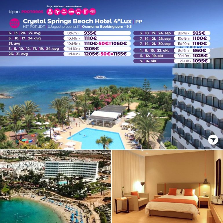 Хотел се налази у близини живописне рибарске луке, на 5 км од Протараса. Гостима су у оквиру хотела на располагању отворени базен, засебан дечији базен и собе са намештеним балконом и погледом на Средоземно море. Све собе хотела Crystal Springs Beach су климатизоване и светле. Понуда ресторана Саламина обухвата тематске вечери, интернационалне специјалитете, регионалну храну и посебан дечији мени.