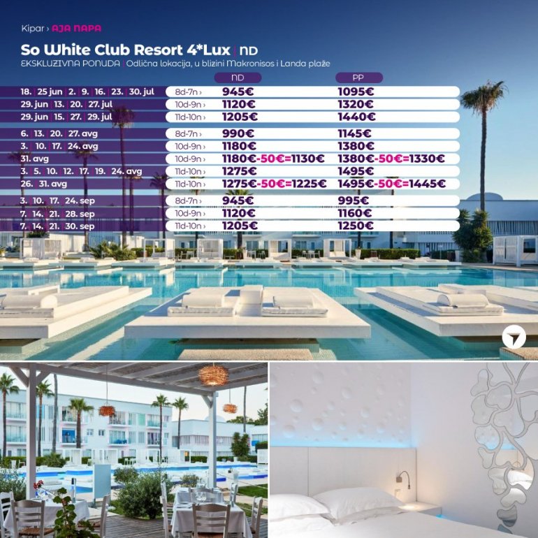 Објекат So White Club Resort налази се на предивној Златној плажи у летовалишту Аја Напа. У понуди су базен у стилу лагуне са плутајућим лежаљкама и награђивани ресторан. Овај бутик хотел у Аја Напи је дизајнирао један од најбољих 50 дизајнера на свету. Поред задивљујућих тропских вртова налази се потпуно бео базен, који може мењати боје, са јединственим ефектом неба у позадини. На плажи су доступни спортови на води, гњурање и роњење. Космополитски центар ноћног живота Аја Напе налази се на само 3,5 км од хотела и до њега се лако и брзо стиже аутобусом и таксијем.