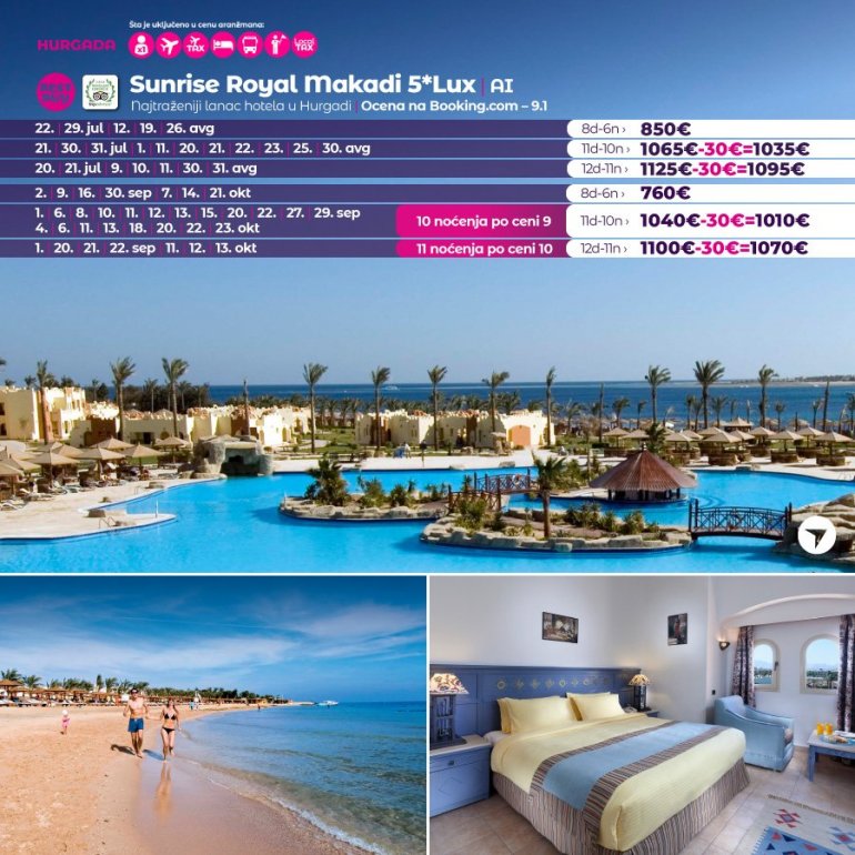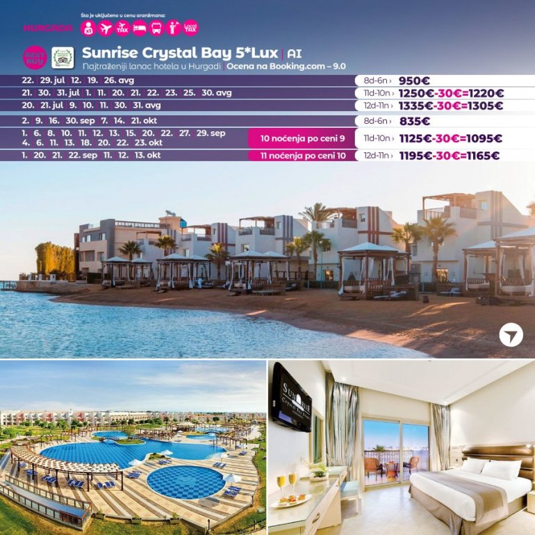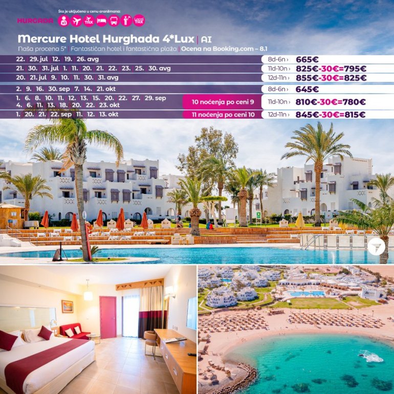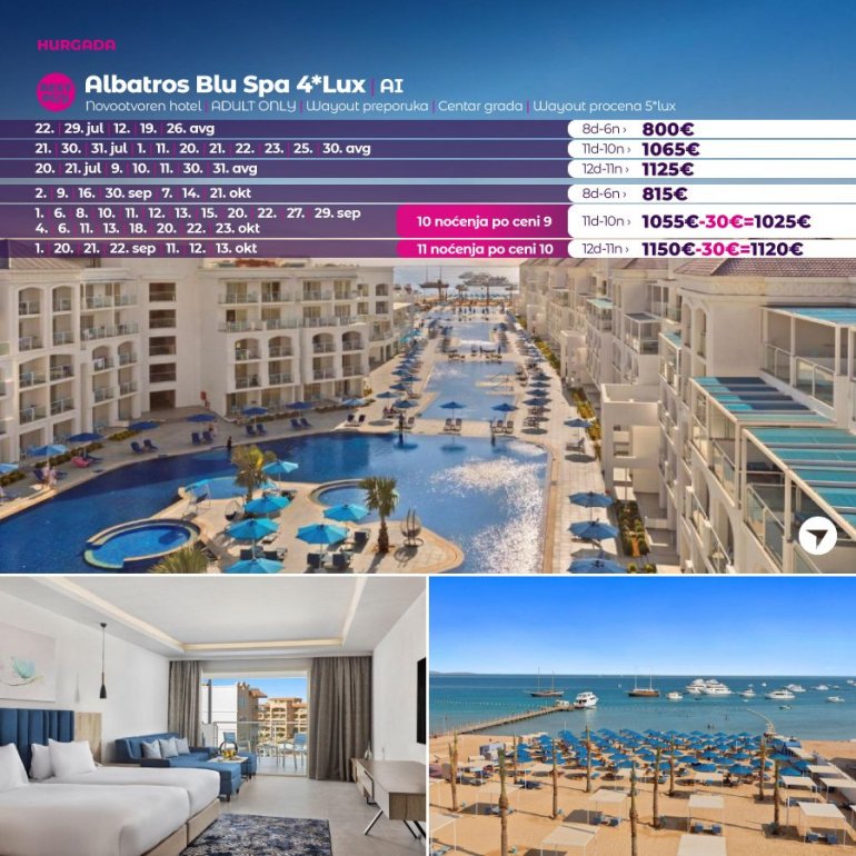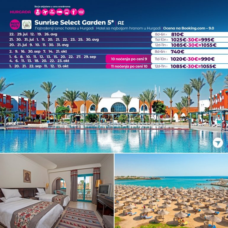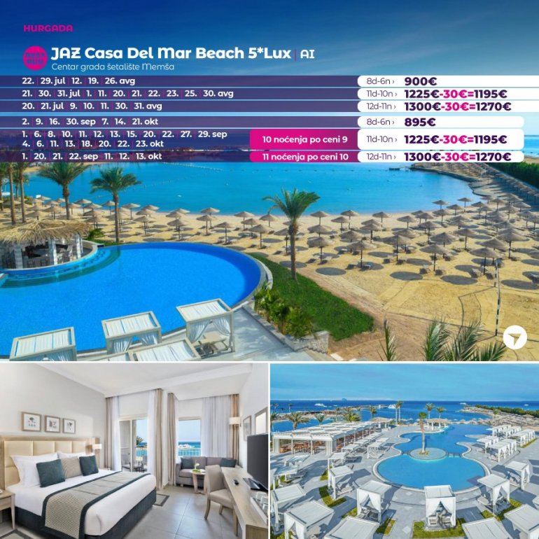 Време је идеално да посетите Хургаду, а као туроператор бр. 1 по броју путника из региона последњих 10 година, за своје путнике смо на основу дугогодишњег искуства издвојили из понуде БЕСТ БУY хотеле који имају најбољи однос цене и квалитет.