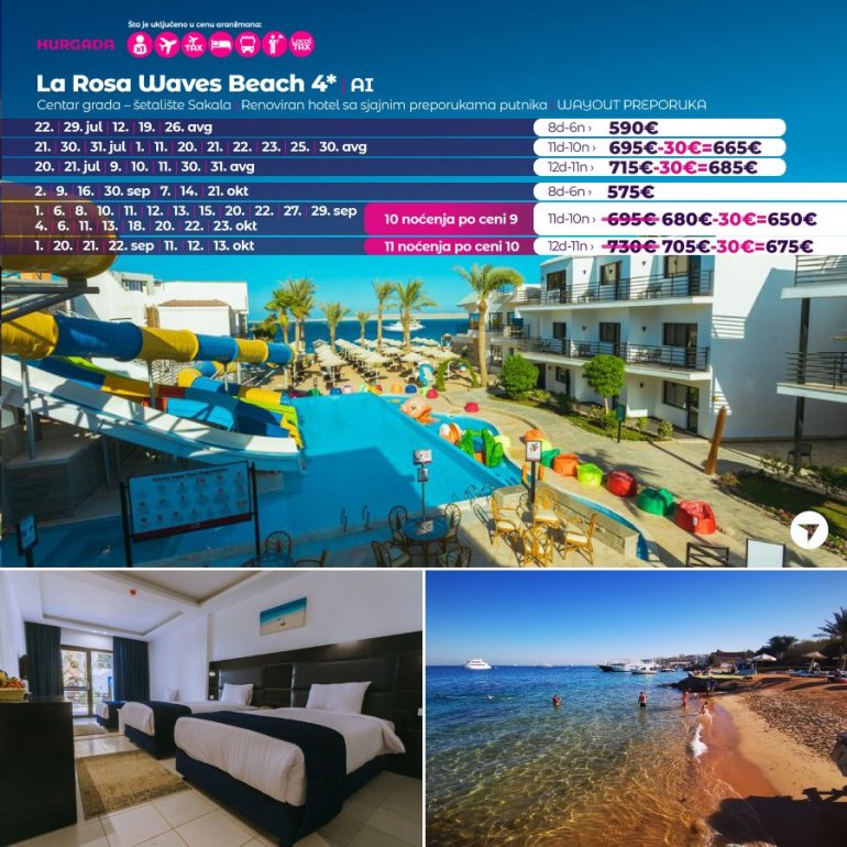 Објекат La Rosa Waves Beach нуди смештај поред плаже у Хургади, на нешто мање од 1 км од плаже Оранге. У понуди су разноврсни садржаји попут фитнес центра, бара и врта. Рецепција ради нон-стоп, а гостима овог објекта на располагању су ресторан, аква-парк и базен на отвореном. Понуда смештајног објекта укључује послугу у соби и дечији клуб.