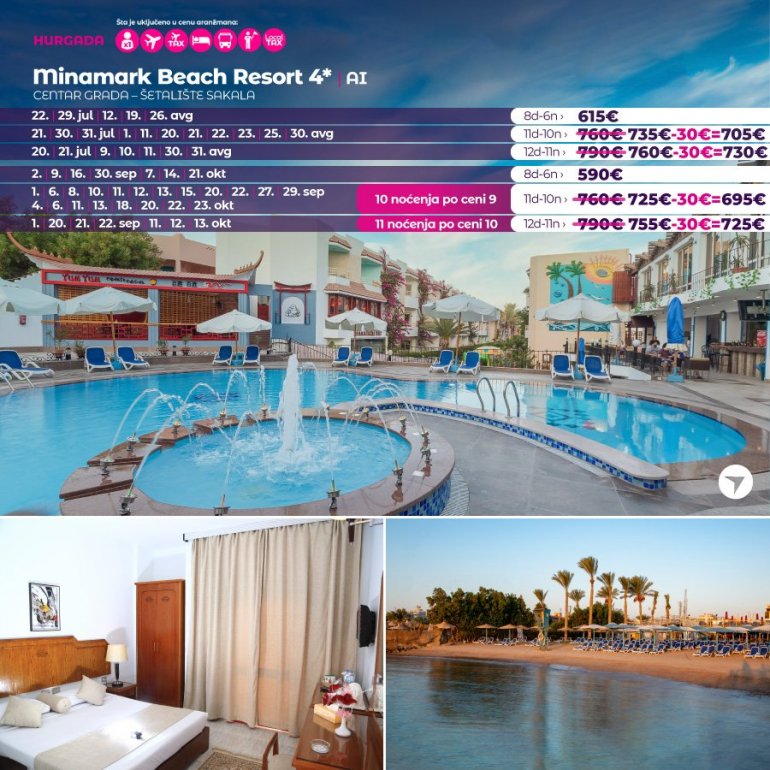 На само 5 минута од аеродрома у Хургади, уживајте у величанственој хармонији Црвеног мора и природе.Налази се на новом шеталишту Хургаде, на сопственој пешчаној плажи. Свака соба има терасу или балкон, сеф, мини бар, клима уређај, две телефонске линије, сат тв, апарат за чај и кафу, фен и прибор за шивење. У оквиру хотела је неколико ресторана са интернационалном кухињиом и барова. Ту су још и три базена и један за децу, спа центар, фитнес центар, терен за тенис, стони тенис, билијар, одбојка на песку, анимација, клуб за децу од 4 до 12 година... У оквиру хотела је и мали шопинг центар са златарама, гифт шоповима, продавницама сувенира, парфимерија, фризерски салон, татоо салон и банка.