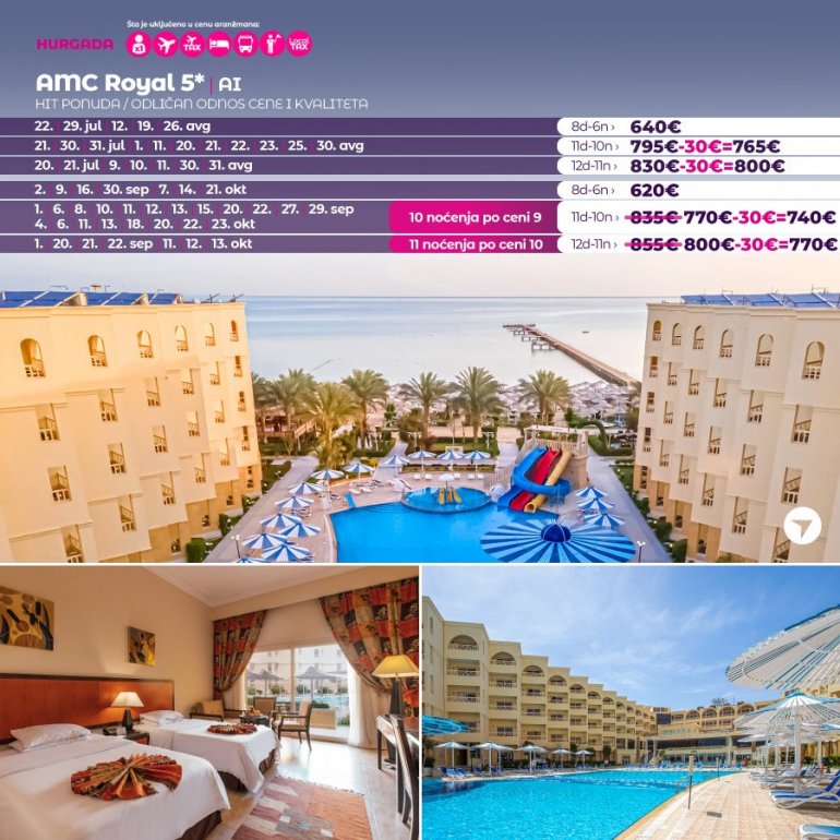 Смештен на самој плажи у Хургади, хотел АМЦ Роyал налази се у области Алахја. Поседује приватну плажу и велики избор садржаја за спортове на води, укључујући роњење и гњурање.
