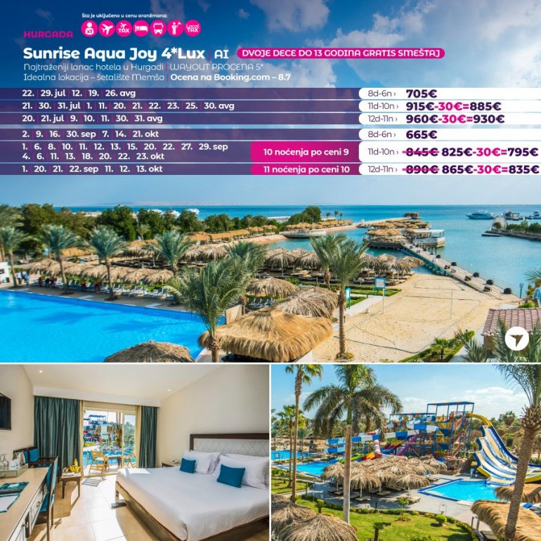 Породични хотел који нуди 6 базена на отвореном, садржаје за паркинг и коришћење приватне плаже, а налази се поред плаже у Хургади. Понуда објекта Аqуа Јоy Ресорт- бy СУНРИСЕ укључује интернационалне, италијанске, азијске, египатске, грчке и ресторане који служе јела од морских плодова. У објекту се налази и 5 барова, укључујући шиша бар. Садржаји хотела обухватају аква-парк, теретану, спа центар и козметички салон.