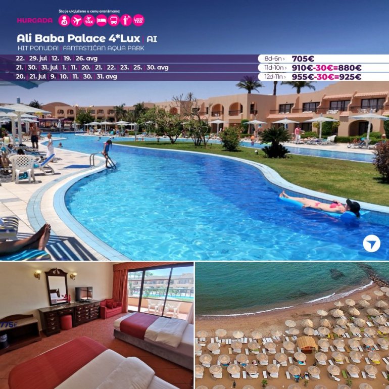 Али Баба Палаце је луксузни хотел са 4* отворен 2001.године на 120 000м2, који се налази 15 километра од центра Хургаде и 8 километара од аеродрома, јужно ка Сафаги. Хотел има сопствену пешчану плажу, прелепо уређен врт, велики базен који дају комплексу утисак оазе. Хотел располаже са 654 стандардне собе, од којих све имају климу, САТ ТВ, мини фрижидер, сеф, балкон. Гостима хотела су на располагању највећи отворени базен у Хургади (2700 м2), затворени базен, дечији базен који се греје, игралиште, главни ресторан, италијански ресторан, оријентални ресторан, 5 барова (на плажи, поред базена, у лобију), фитнес центар, 2 тениска терена, миниголф, одбојка на плажи, стони тенис, мини клуб за децу, куглање, клизање, сауна, собе за масажу, ђакузи, парно купатило, центар за спортове на води. Услуга у хотелу је на бази алл инцлусиве концепта по правилима хотела.