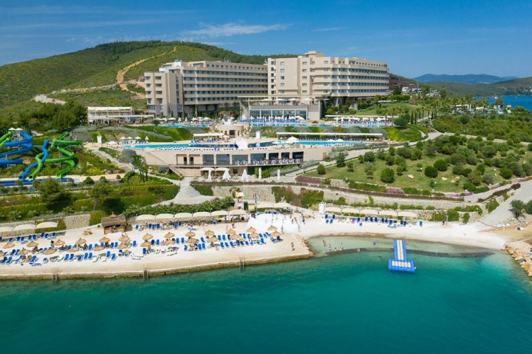 Хотел ће вас засигурно задивити својим пространством, на површини од 82.000 м2 - приватна плажа, отворени и затворени базени, бројни а ла царте ресторани, аква парк, спа центар, теретана… А тек за малишане, мини клуб, игралиште, дечији базени, прегршт анимација и активности. Док се они добро забављају на свој начин, а кад сте већ у Turskoj, ви не пропустите да употпуните одмор опуштањем на турски начин, у турском купатилу – хамаму, где ћете дух и тело припремити за потпуно уживање на егејској обали.