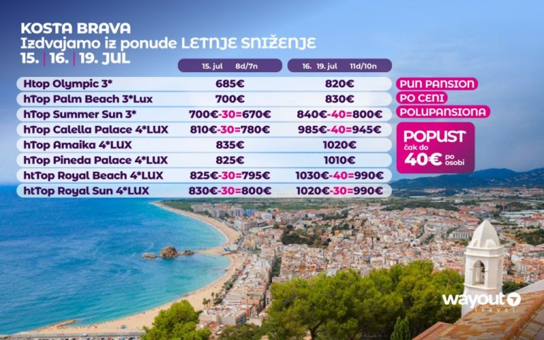 Wayout агенција је за своје путнике припремила неодољиву понуду за поменуту област која се налази надомак Барселоне, а као посебна погодност се издвајају хотели који нуде услугу пуног пансиона по цени полупансиона. У питању је познати хотелски ланац HTop Hotels, а у Wayoutu можете пронаћи поменуту понуду уз ексклузивне цене за летњу сезону почевши од јунских полазака када је и право време да уз посету Коста Брави. Посетите и један од најлепших градова Старог континента, Барселону, која се налази на око сат времена удаљености од обале Коста Браве. Такође, неки од излета које не би требало пропустити су свакако обилазак града Ђироне или одласка до фантастичне Тосе Дел Мар.